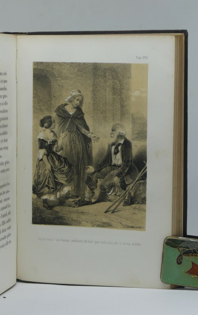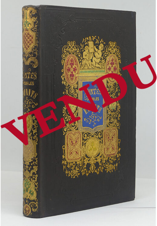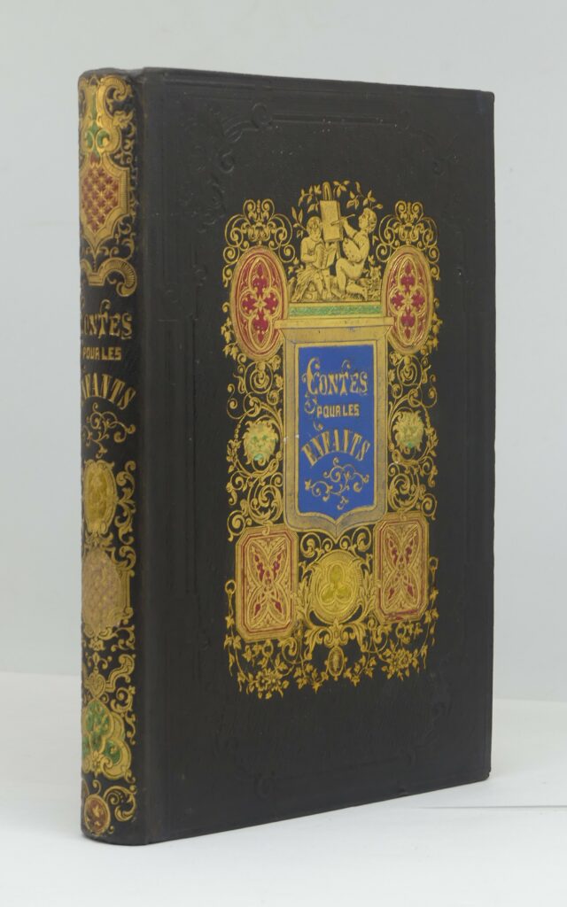 Andersen (Hans Christian). Contes pour les enfants par Hans Christian Andersen. Traduits du danois par V. Caralp [pseudonyme de François Garay]. Illustrations à deux teintes par Derancourt. Paris, Belin-Leprieur et Morizot, s. d. (1848). In-8. Beau cartonnage de l’éditeur en percaline noire à décor doré, vert, rouge, bleu, ornant les plats et le dos ; tranches dorées. 2 ff., 329 p., 1 ff. 12 illustrations, chacune à pleine page. 134×208 mm. Très bel exemplaire, quasiment sans rousseurs.