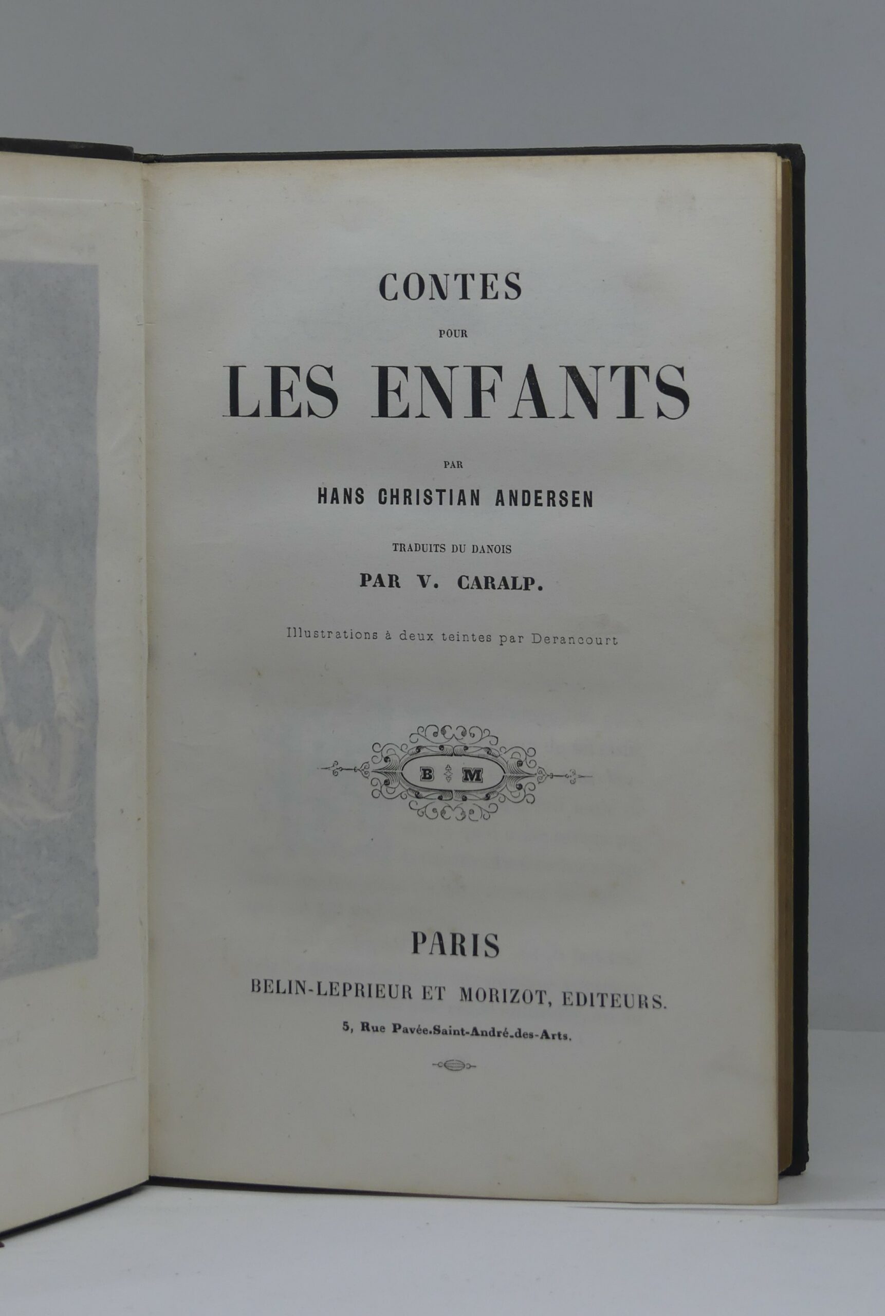 Andersen (Hans Christian). Contes pour les enfants par Hans Christian Andersen. Traduits du danois par V. Caralp [pseudonyme de François Garay]. Illustrations à deux teintes par Derancourt. Paris, Belin-Leprieur et Morizot, s. d. (1848). In-8. Beau cartonnage de l’éditeur en percaline noire à décor doré, vert, rouge, bleu, ornant les plats et le dos ; tranches dorées. 2 ff., 329 p., 1 ff. 12 illustrations, chacune à pleine page. 134×208 mm. Très bel exemplaire, quasiment sans rousseurs.