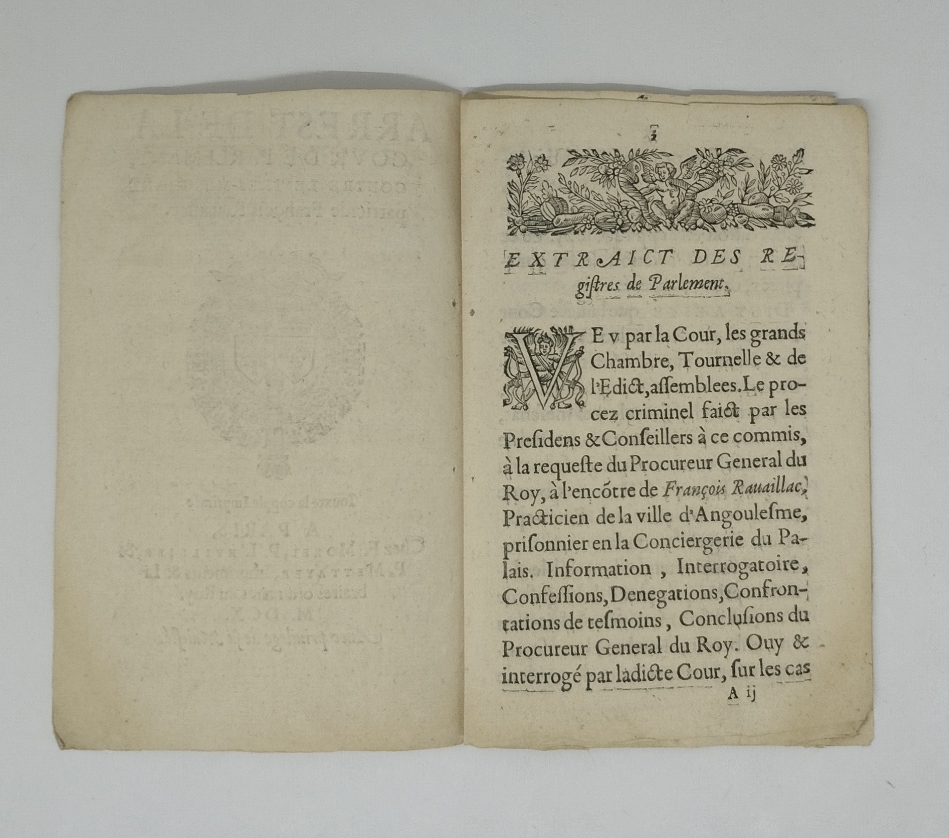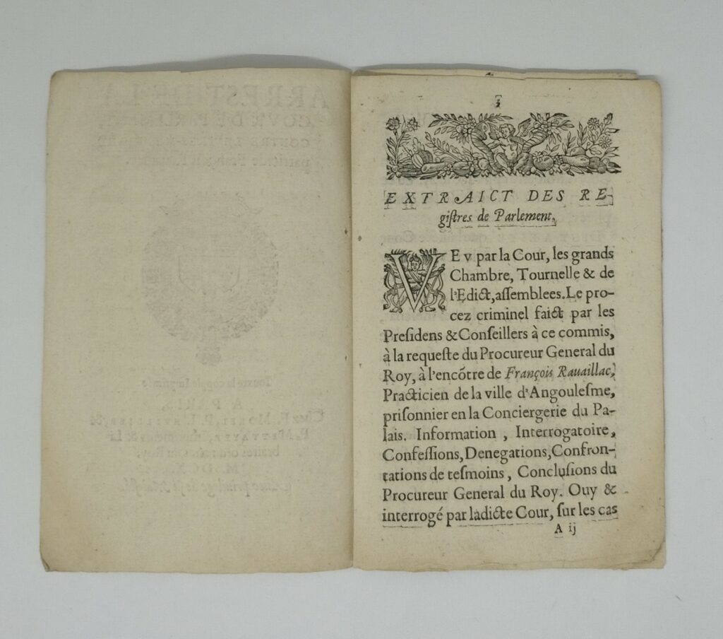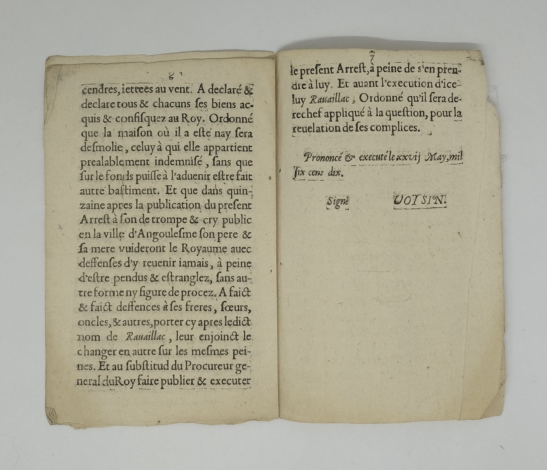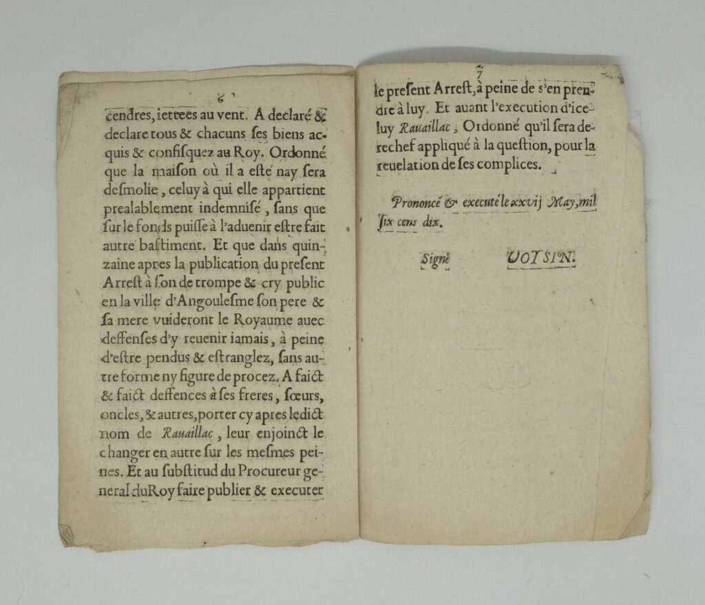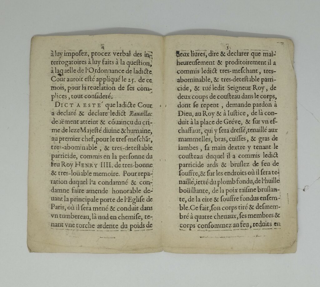 Ce rare document livre les détails du célèbre châtiment infligé au meurtrier du roi Henri IV : « … de là conduit à la place de Grève, et sur un eschafaut qui y sera dressé, tenaillé aux mammelles, bras, cuisses (…) bruslez de feu de souffre, et sur les endroits où il sera tenaillé, jetté du plomb fondu, de l’huile bouillante (…) corps tiré et desmembré à quatre chevaux (…) cendres, jettees au vent (…) pere et sa mere vuideront le Royaume avec deffences d’y revenir jamais, à peine d’estre pendus et estranglez, sans autre forme ni figure de procez… »