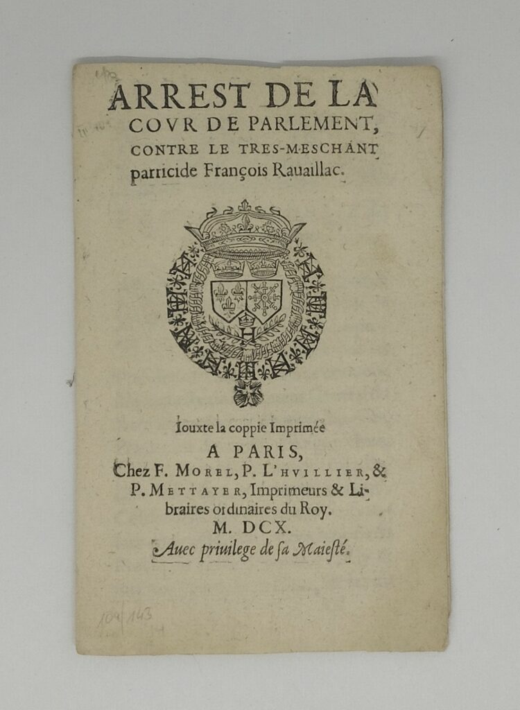 [Ravaillac]. Arrest de la Cour de Parlement contre le tres-meschant parricide François Ravaillac. Jouxte la coppie imprimée. A Paris, chez F. Morel, P. L’Huillier et P. Mettayer Imprimeurs et Libraires ordinaires du Roy. 1610. Avec privilège de sa Majesté. Broché, 7 pp. 95×152 mm. Un petit manque de papier au dernier feuillet. Deux petits trous près de la charnière : ce fascicule avait à l’origine une couverture ; il n’est pas extrait d’une reliure.