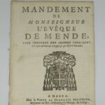 Sorcellerie- Autres [TELESFORO DI COSENZA]. Livre merveilleux, contenant en bref la Fleur et substance de plusieurs traittez, tant des Propheties & revelations, qu’anciennes Croniques, faisant mention de tous les faictz de l’Église universelle, comme des scismes, discords & tribulations advenir en l’Église … Collectif. MERCURE GALANT. Aoust [août] 1692. Paris, Chez Chez G. de Luyne, T. Girard, Et Michel Brunet, 1692. Édition originale. Pet. in-8 (145 x 84 mm). 334 p., 1 f.n.ch. 2 gravures, une médaille et un feuillet de musique replié. Veau brun moucheté, dos à cinq nerfs orné, caissons et fleurons … Gabriel-Florent de Choiseul-Beaupré, Evêque de Mende. Mandement de Monseigneur l’Evêque de Mende, pour ordonner des prières publiques, à l’occasion de l’animal anthropophage qui désole le Gévaudan. A Mende. Chez la Veuve de François Bergeron, Imprimeur du Roi, de Monseigneur l’Evêque, du Collège, … [Anonyme]. [Bête du Gévaudan]. Figure de la bête féroce. Feuille de colportage, 197×328 mm (155×85 pour le dessin). Avec Permission. Petits manques, taches. Provenance : cachet « G.H. » réservé Feuillet d’époque se rapportant à la bête du Gévaudan, qui se manifesta de 1764 à 1767. Il est question … De Lisle de Moncel (Nicolas). Méthodes et projets pour parvenir à la destruction des loups dans le royaume. A Paris, de l’Imprimerie royale. xiv et 322 pages. Un tableau dépliant relié à la fin, au sujet des loups tués de 1765 à 1768. Pleine basane (reliure de l’époque). Trois manques … Collectif. MERCURE DE FRANCE du 31 janvier 1784, à Paris. Numéro broché. La pagination va de 194 à 240. (182×113 mm) 80 euros Il figure aux pages 215-217 une « lettre qui contient un fait assez singulier ; elle a été écrite de Kerry en Irlande par le Colonel Simon Thompson. » L’histoire est … Berthet, Élie. La Bête du Gévaudan. Paris, Hachette, 1862. In-12. 2 ff., 396 p. 110×175 mm. Demi-percaline bleue (reliure de l’époque). L’intérieur est globalement frais. Déchirures restaurées aux p. 307-318 (sans manque). Plats un peu frottés. Deux feuillets en double (sans manque). 120 euros La … CROWE, Catherine. Les côtés obscurs de la nature ou fantomes et voyants, par Mistress Crowe. Traduit de l’anglais par Z. Paris, Leymarie, Editeur, 1900. Un volume, demi chagrin brun à nerfs, couvertures non conservées (reliure de l’époque). VIII, 509 pp, 1 ff. (table). 130×210 mm. Édition …