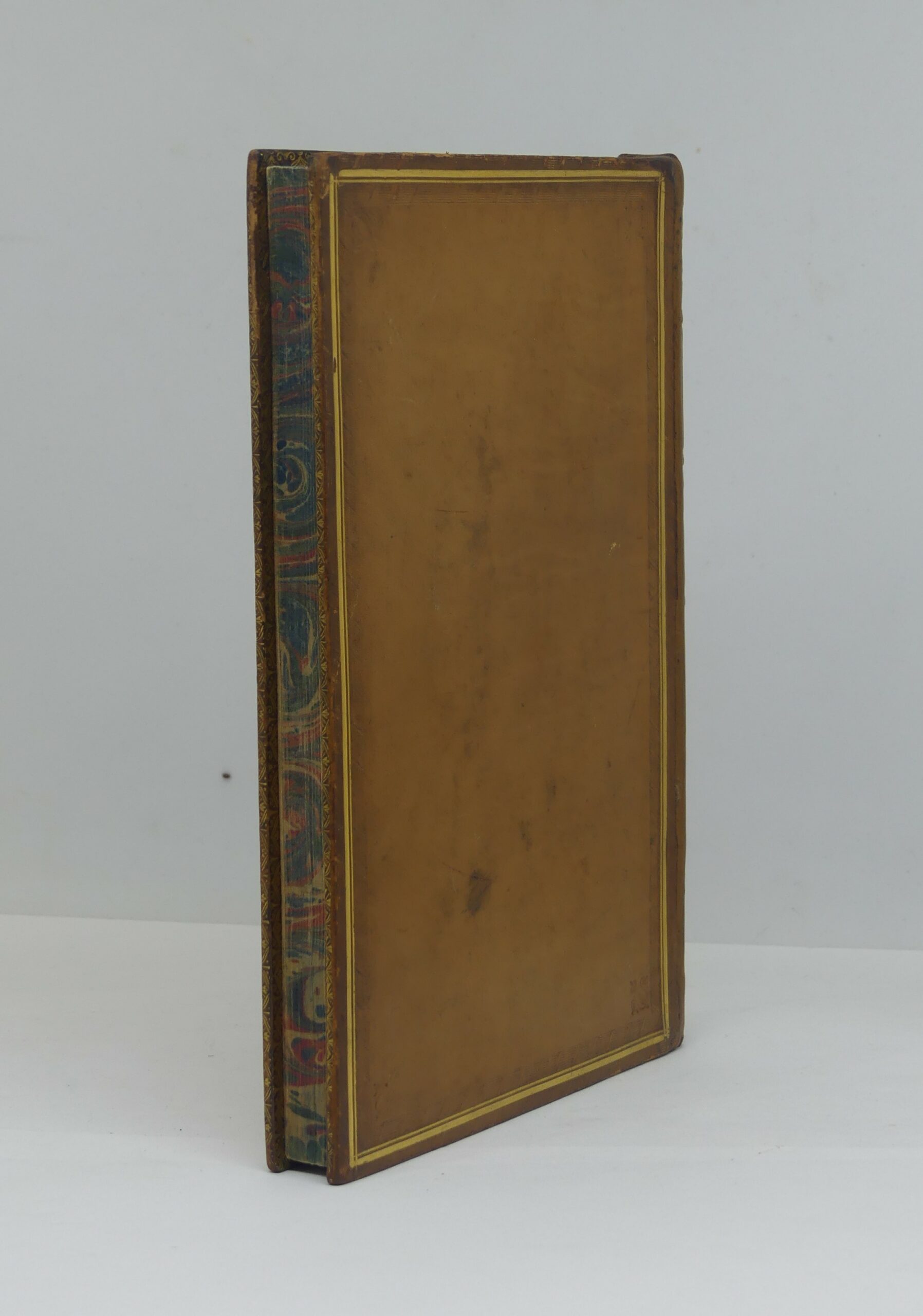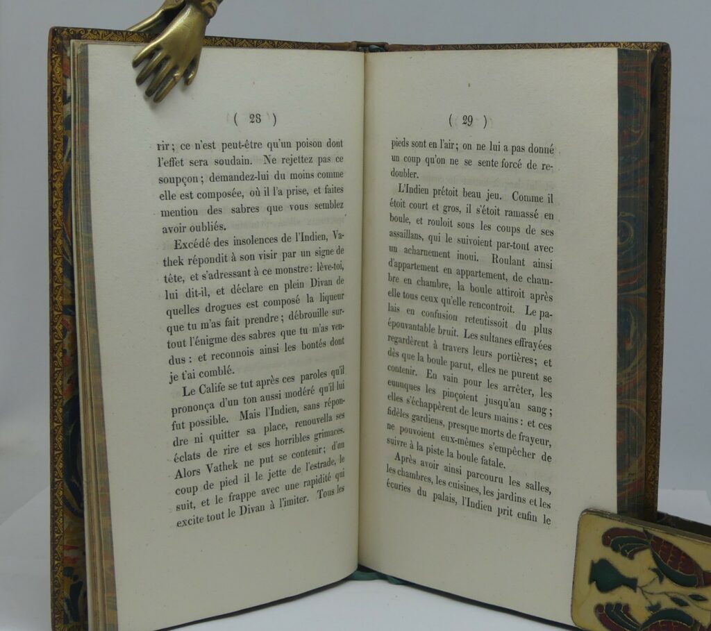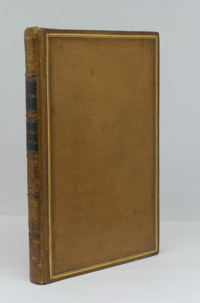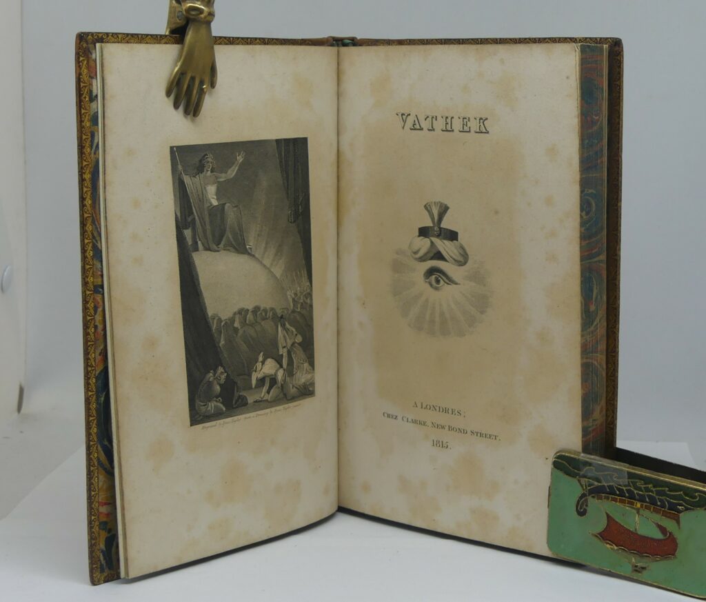 BECKFORD (William). Vathek. A Londres chez Clarke, 1815. In-8, veau blond, filets dorés et roulette à froid en encadrement, petits fleurons d’angle à froid, dos lisse orné, pièces de titre noires, tranches marbrées (reliure anglaise de l’époque). Rousseurs au frontispice et sur le titre ; le reste de l’ouvrage est d’une grande fraîcheur. Restaurations au dos, coiffes refaites. Très bel exemplaire sinon. Frontispice ; 2 ff ; 218 p. 187×123 mm. Sans le feuillet d’errata.