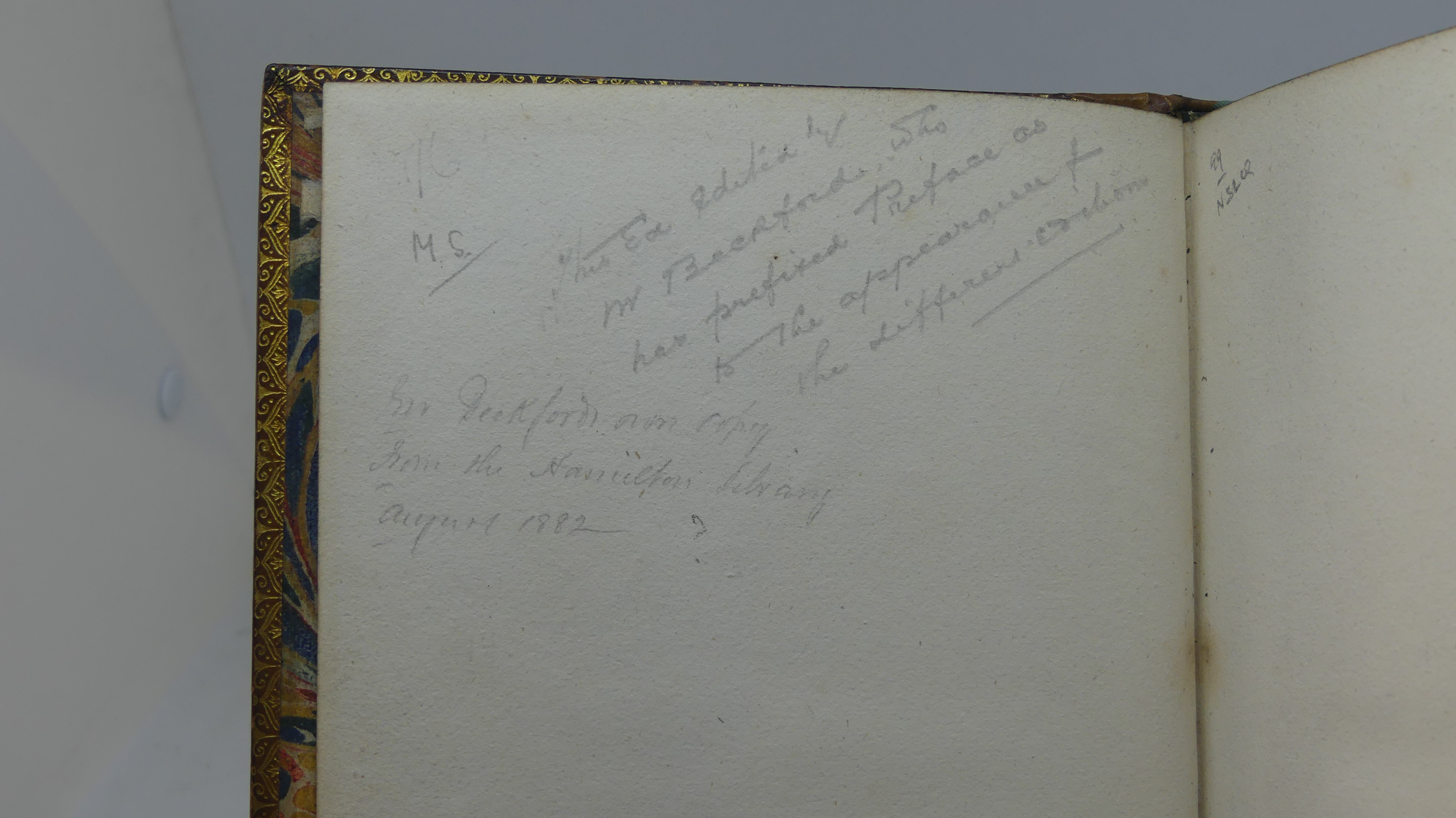 Une note ancienne au crayon en anglais sur la première garde indique : « Sir Beckford’s own copy from the Hamilton Library august 1882 » mais rien ne nous permet de l’attester. La vente publique de la première partie de la bibliothèque de l’écrivain eut lieu le 30 juin et les onze premiers jours de juillet 1882, si l’on en croit ce qu’annonce le titre du catalogue. Il y figurait deux exemplaires de cette édition, décrits très sommairement : le n° 728 (« uncut ») et le n° 729 (« another copy, calf extra »), qui pourrait – pourquoi pas – correspondre au nôtre. La seconde vente eut lieu fin 1882 et les deux autres en juillet et novembre 1883. La vente dédiée aux livres « imparfaits » se déroula quant à elle en mai 1884. Nous ne savons rien de plus. Nous n’avons pas cherché à savoir si la première vente s’est prolongée jusqu’à août 1882.