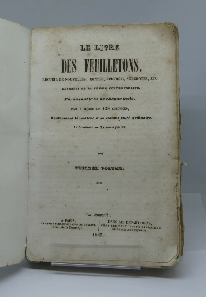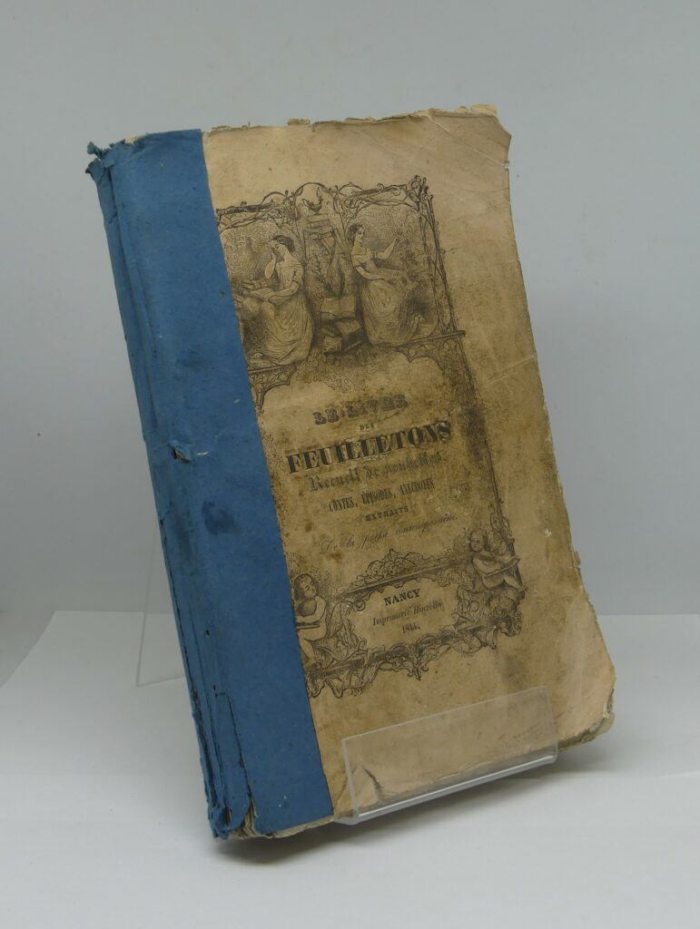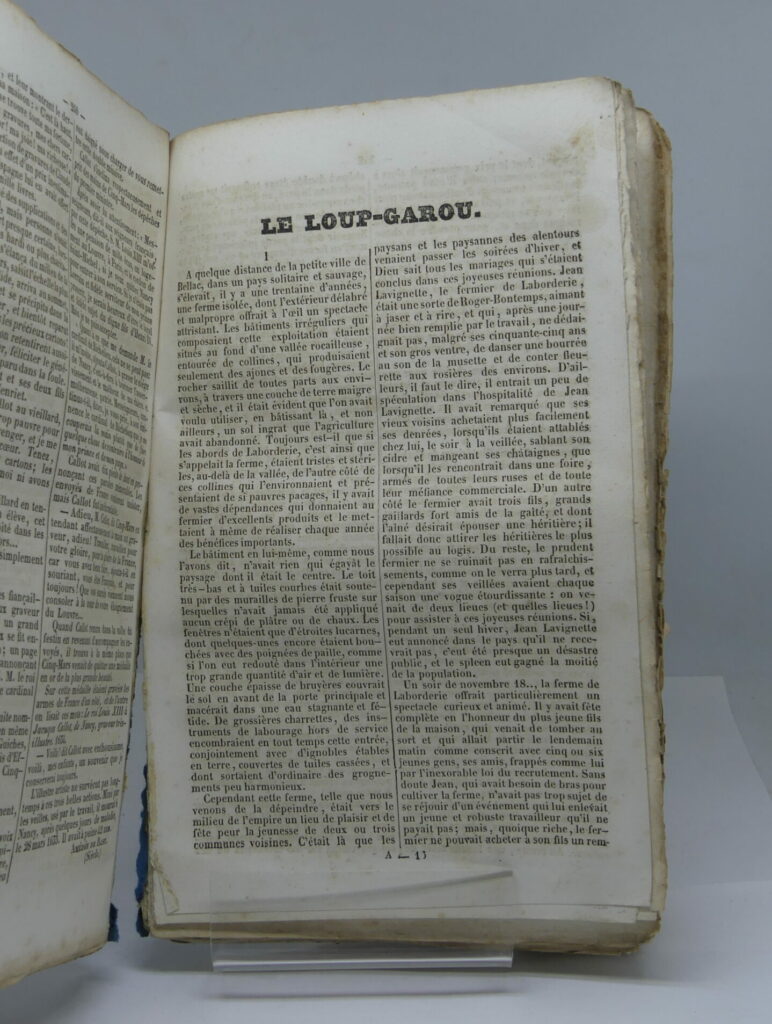 [Berthet, Elie] Le Loup-Garou, in Le Livre des feuilletons, Recueil de Nouvelles, Contes, Episodes, Anecdotes extraits de la Presse contemporaine. Nancy, Imprimerie Hinzelin, 1843. Broché, 382 p. et un frontispice. 142×220 mm. Brochage renforcé par une bande de papier collée. Dos fendu, fragilisé. Couverture salie et usée. Il manque peut-être le feuillet 383-384.* Intérieur en état satisfaisant. Rare.