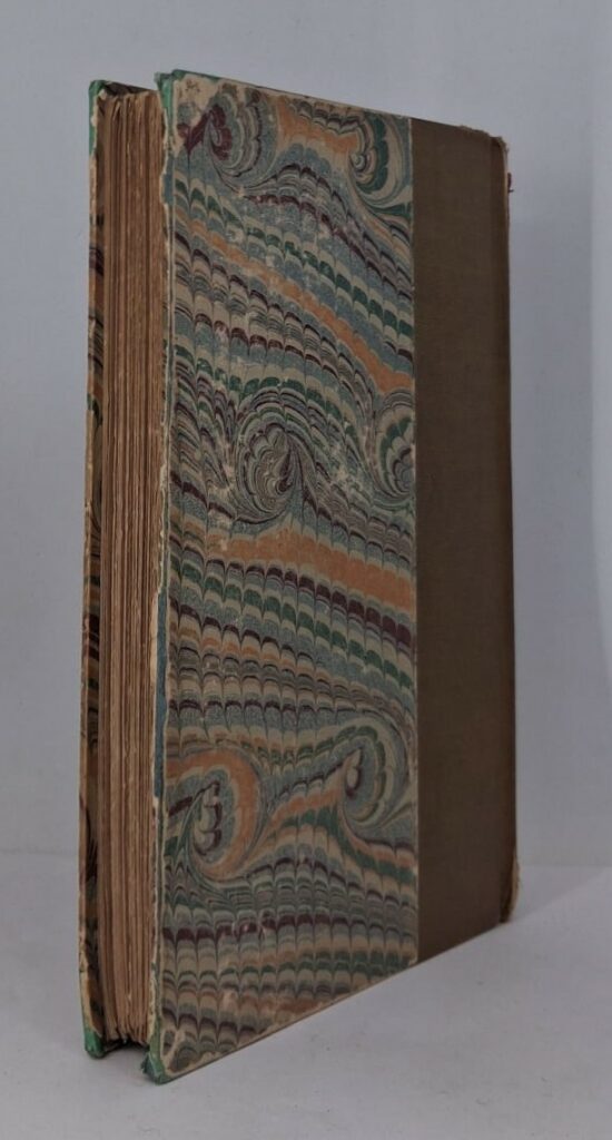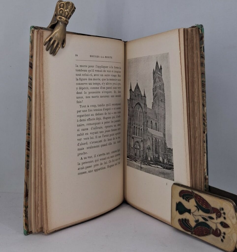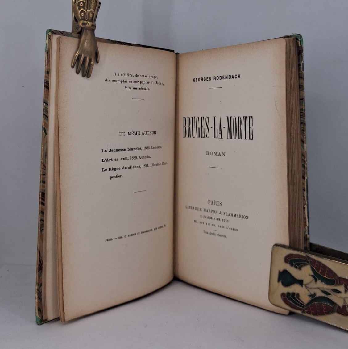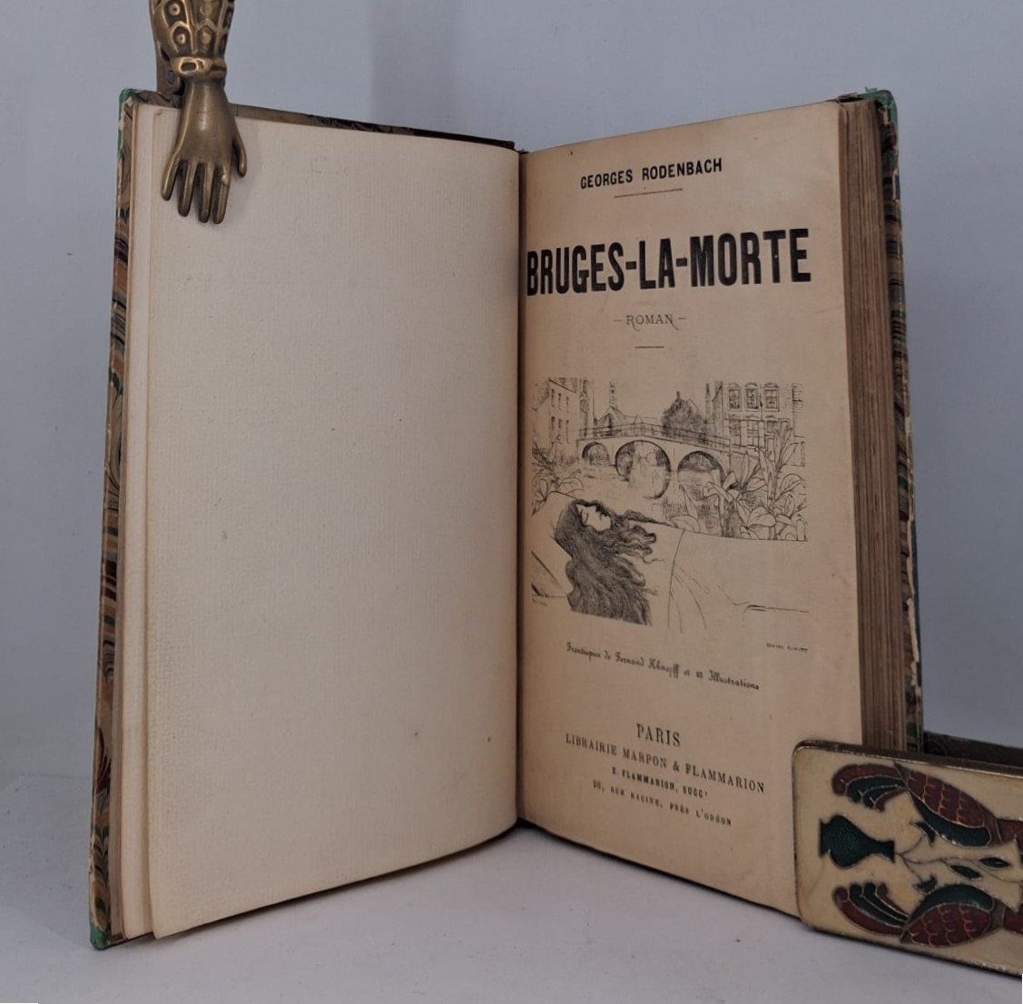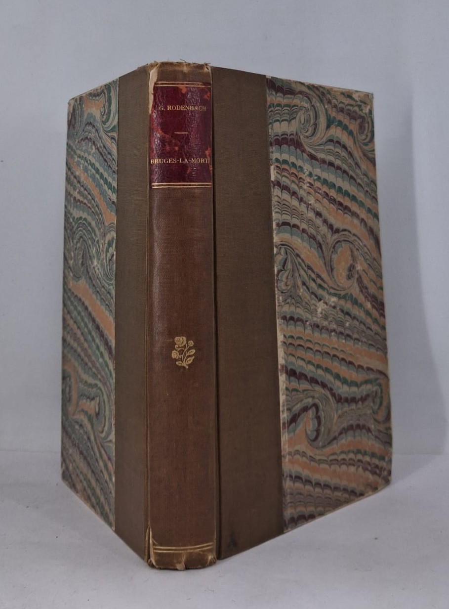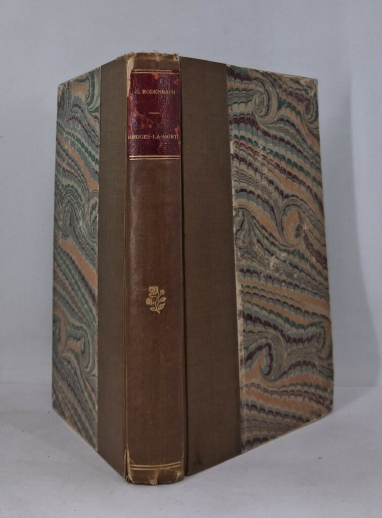 Rodenbach (Georges). Bruges la morte, Paris, Marpon et Flammarion (1892). Demi-percaline marron (reliure de l’époque). Pièce de titre rouge. Petits manques à la pièce de titre et aux mors. Faux-titre, titre, II, 223 p. Dos un peu foncé, avec boursouflures. Très bel état intérieur. Couverture conservée. En partie non rogné. 118×182 mm. Édition originale.
