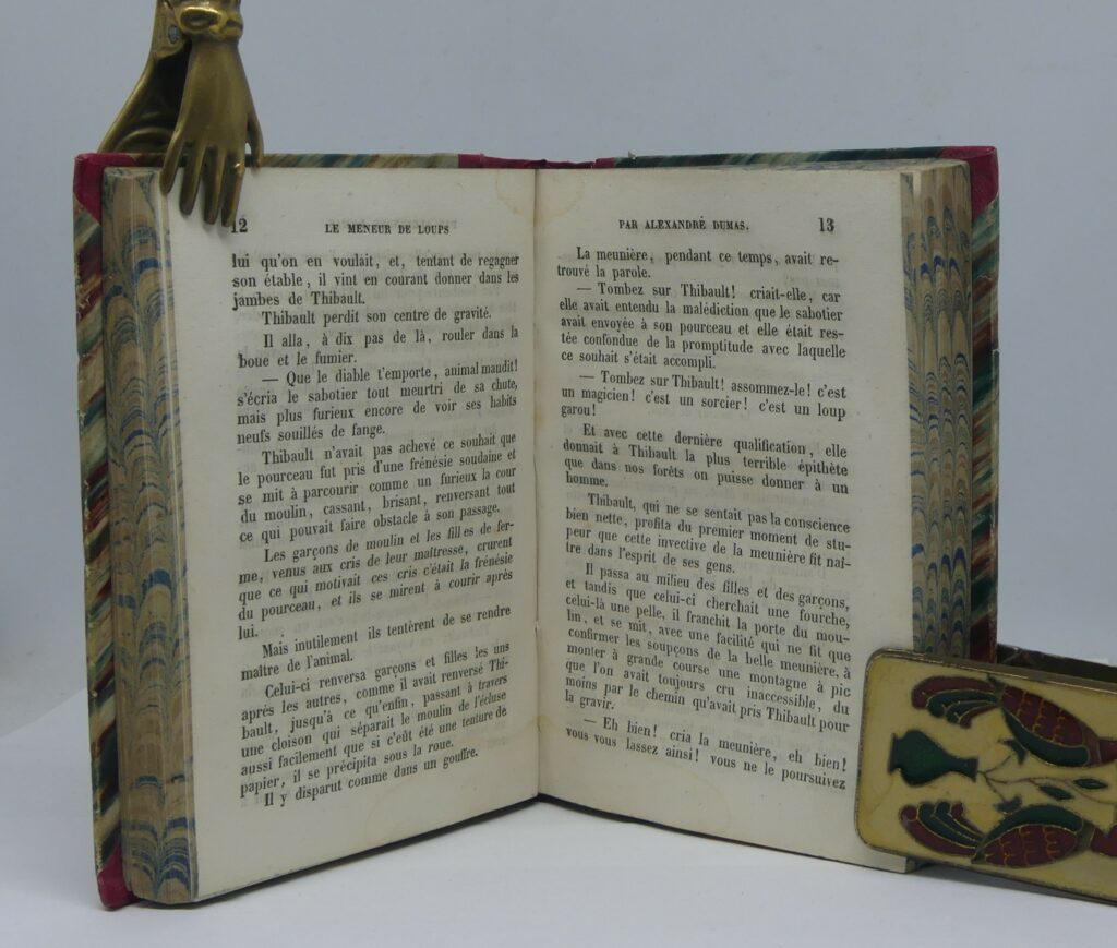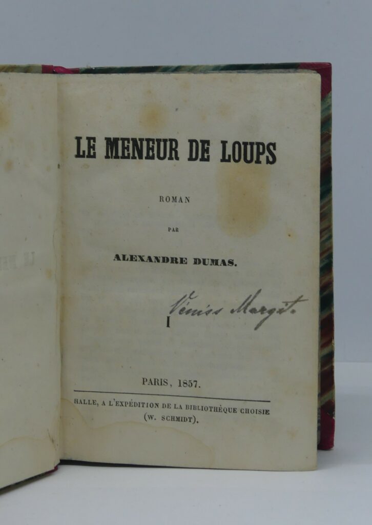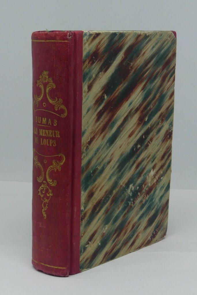 Dumas, Alexandre, Le Meneur de loups, Paris, Halle, à l’Expédition de la Bibliothèque choisie, 1857. 3 tomes en 1 volume. In-8, 160, 160 et 156 p., demi-toile rouge, tranches jaspées (reliure de l’époque). 95×136 mm