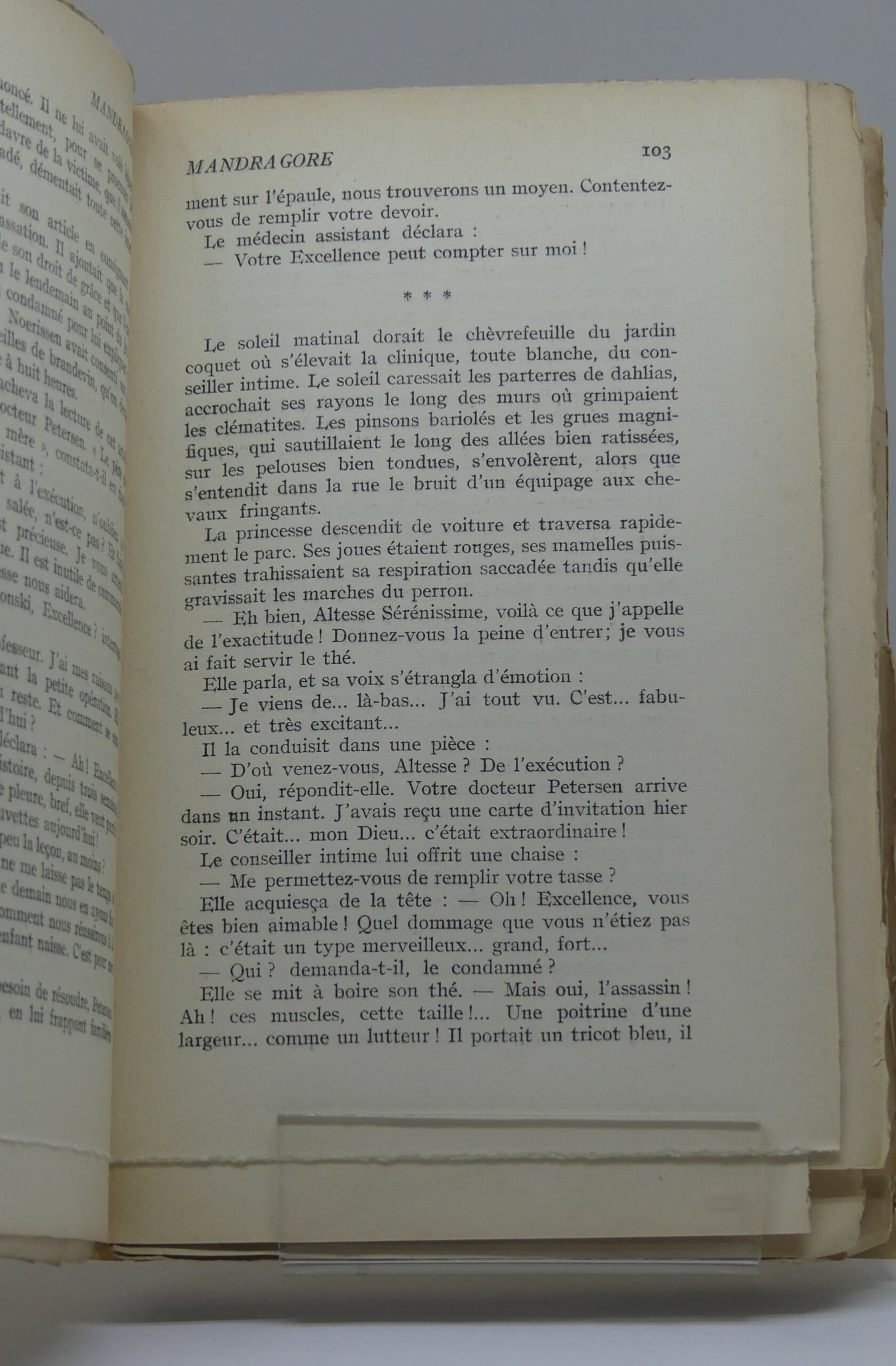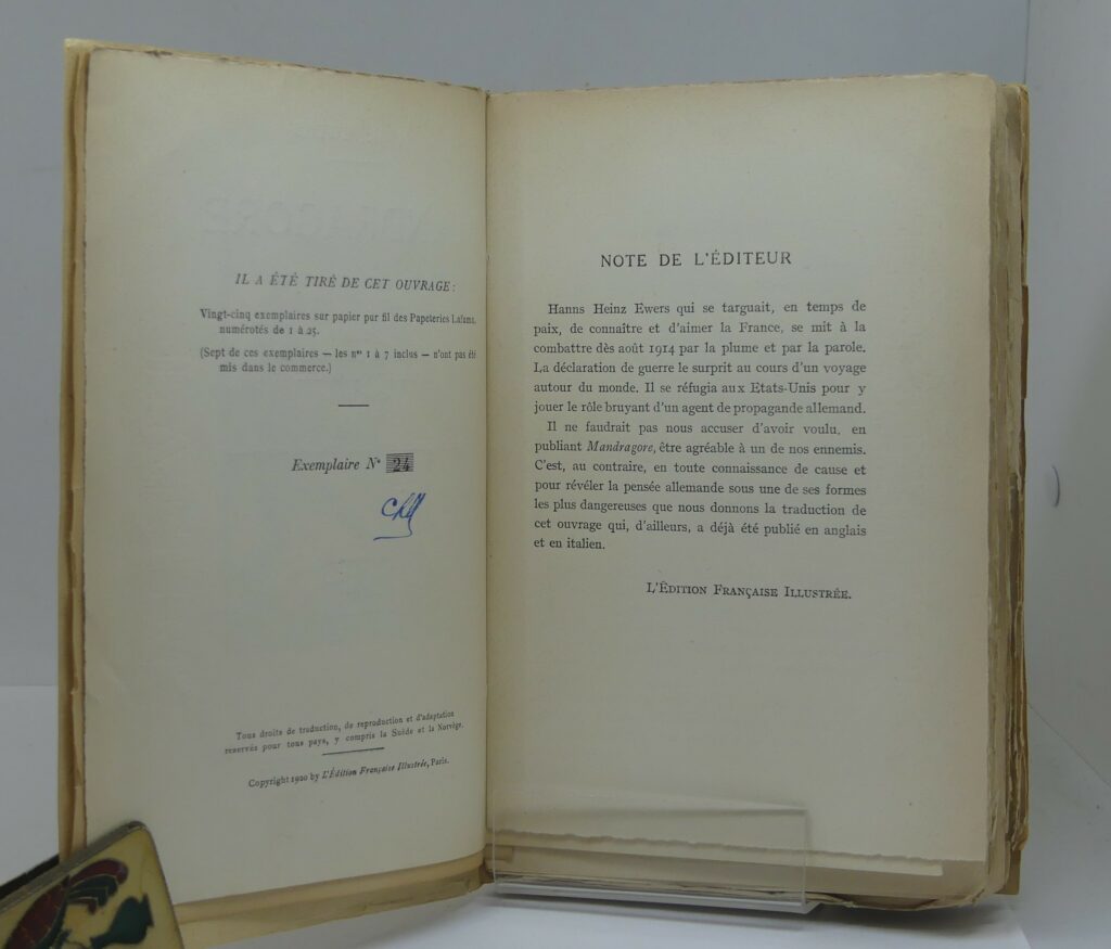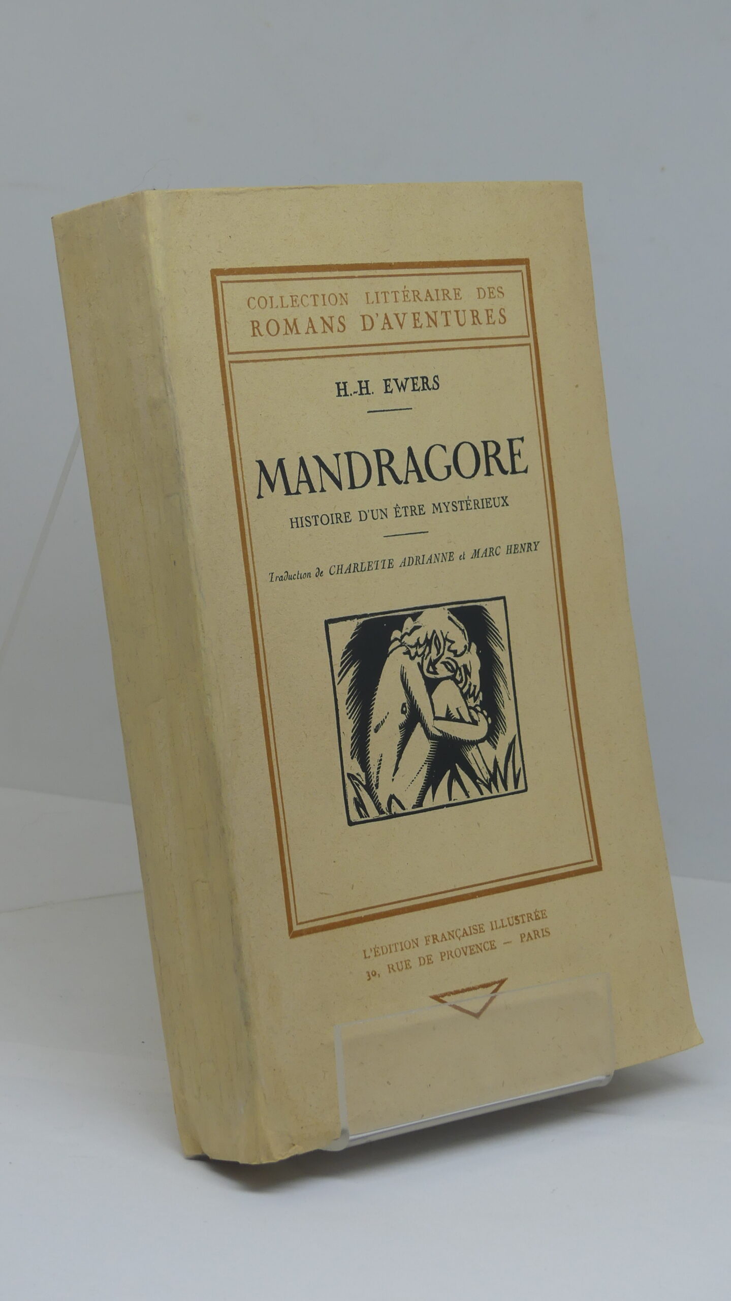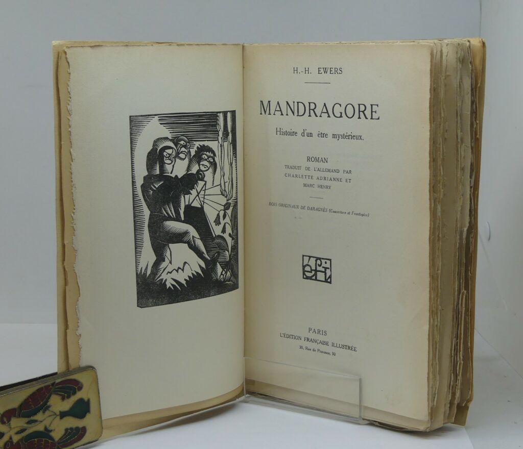 EWERS (Hans Heinz). Mandragore. Histoire d’un être mystérieux. Paris, L’Édition Française illustrée, s.d. (1920). Broché, 302 pp et 1 ff blanc (203×131 mm). Frontispice et illustration de la couverture par Daragnès. Édition originale française. Un des 25 pur fil, seul grand papier, le numéro 24. Traces de restauration au dos (?), minime déchirure sans manque au second plat, pliures sans gravité en bas du premier plat. Très bon exemplaire.