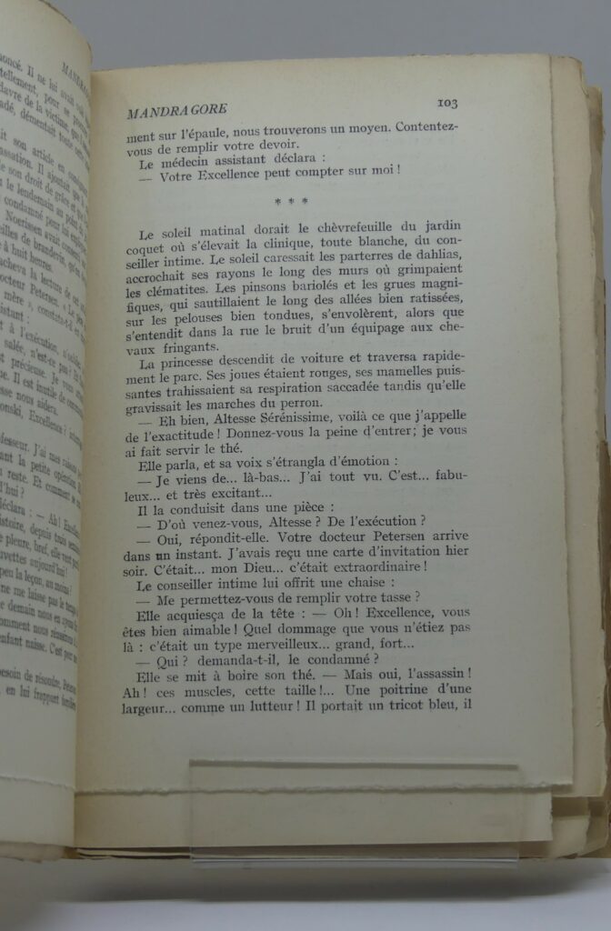 Édition originale française de ce troublant, atypique et excellent roman de littérature fantastique paru une dizaine d’années plus tôt. Il raconte l’histoire de Mandragore dont la mère, une prostituée, a été inséminée avec la semence prélevée sur un condamné à mort, juste après son exécution.