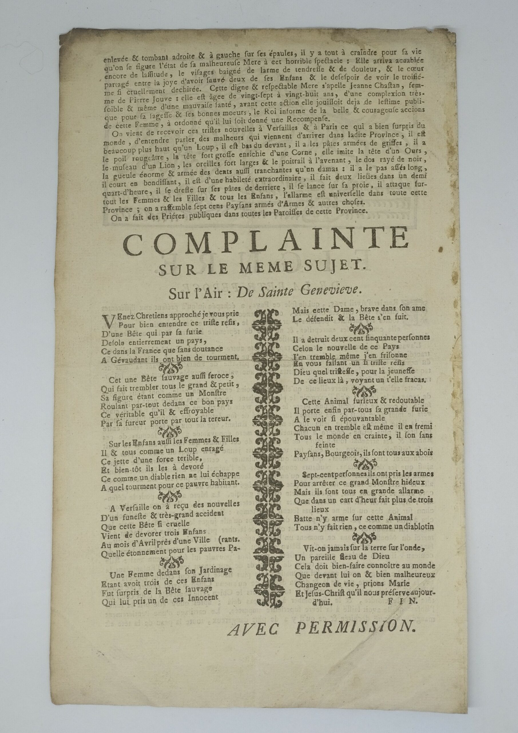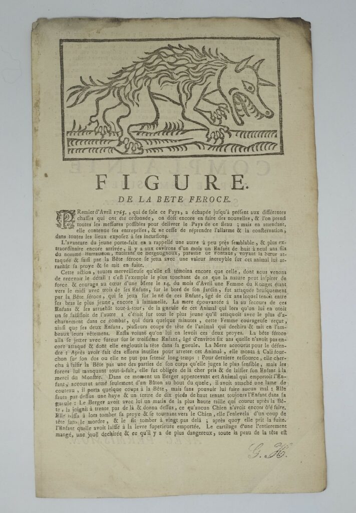 Feuillet d’époque se rapportant à la bête du Gévaudan, qui se manifesta de 1764 à 1767. Il est question de l’attaque d’une mère et ses trois enfants : « le 14. du mois d’avril [1765] une Femme du Rouget étant vers le midi avec trois de ses Enfans, sur le bord de son jardin, fut attaquée brusquement par la Bête féroce, qui se jetta sur le né de ces Enfant, âgé de dix ans lequel tenoit entre ses bras le plus jeune, encore à la mamelle. La mère épouvantée à la au secours de ces Enfans, et les arrachât tour-à-tour de la gueule de cet Animal qui lors qu’on lui en otoit un se saisissoit de l’autre : c’étoit sur tout le plus jeune qu’il attaquoit avec le plus d’acharnement dans ce combat, qui dura quelques minutes, cette Femme courageuse reçut, ainsi que ses deux Enfans, plusieurs coups de tête de l’animal qui déchira et mit en l’ambeaux leurs vêtemens. Enfin voiant qu’on lui en levoit ces deux proyes. La bête féroce alla se jetter avec fureur sur le troisième Enfant, âgé d’environ six ans qu’elle n’avoit pas encore attaqué et dont elle engloutit la tête dans sa gueule. La mere accourut pour le défendre : Après avoir fait des efforts inutiles pour arreter cet Animal, elle monta à Califourchon sur son dos […] elle fut obligée de là cher pris et de laisser son Enfant à la merci du Monstre. Dans ce moment un Berger… »