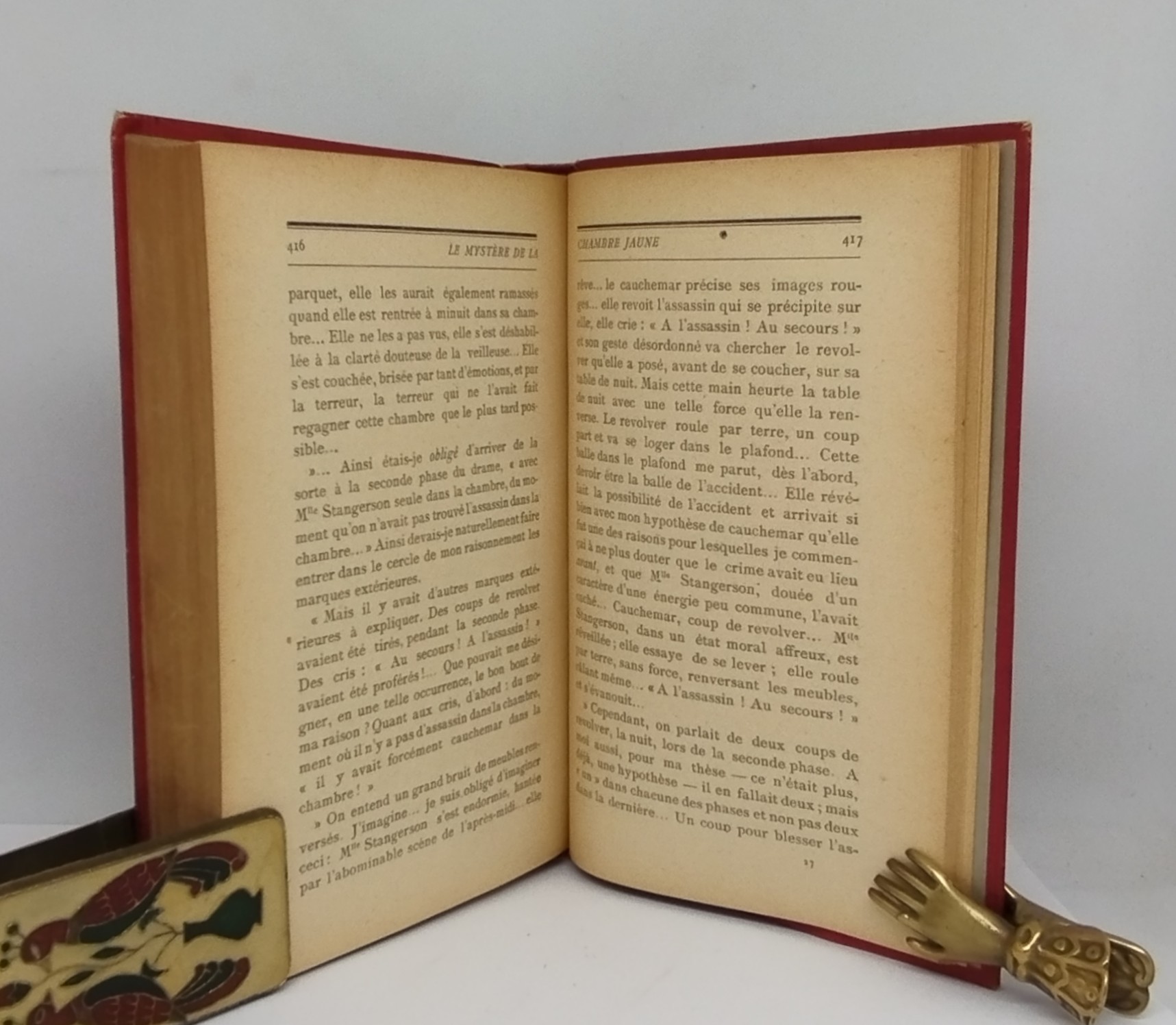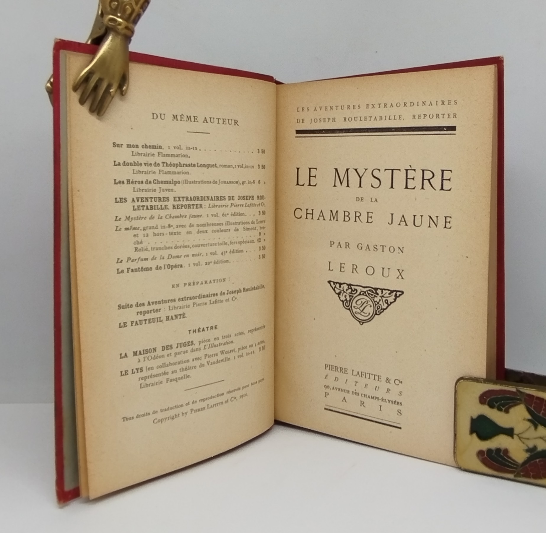 LEROUX (Gaston). Le Mystère de la chambre jaune. Paris, Pierre Lafitte. Un volume. Cartonnage rouge de l’éditeur. 452 p., 1 ff. n. ch. (catalogue de l’éditeur). 110×173 mm.