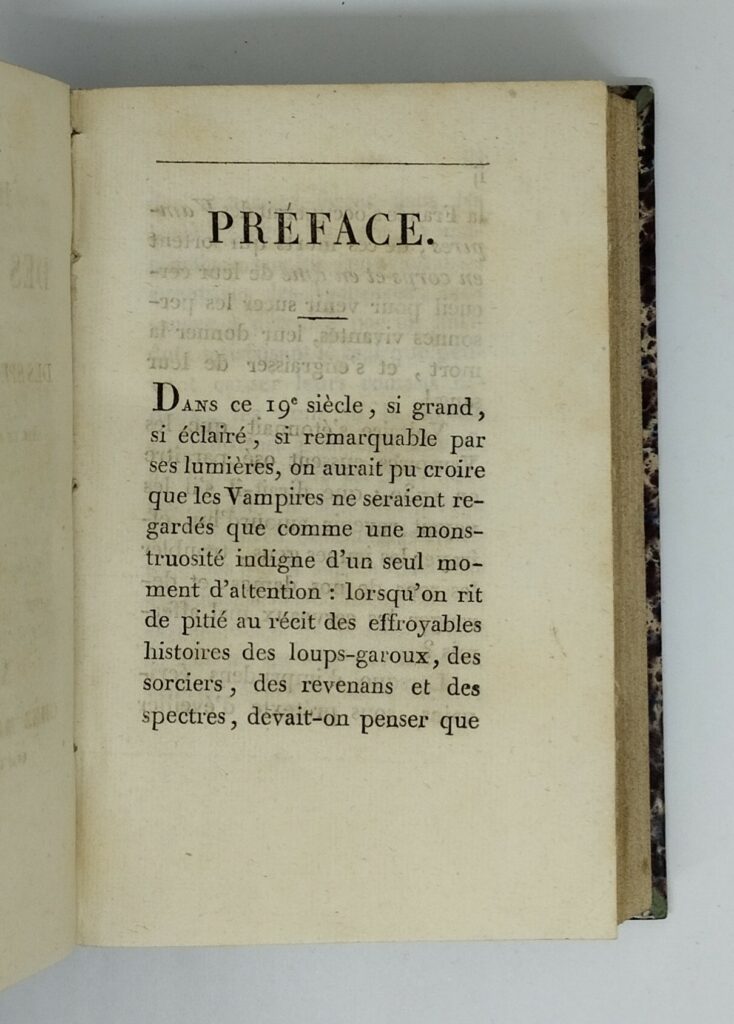 Collin de Plancy (Jacques). Histoire des vampires et des spectres malfaisans avec un examen du vampirisme (Masson, 1820) / Infernaliana (Sanson, 1822). Reliés avec La Sorcellerie de Charles Louandre (Hachette, 1853) et Mesmer et le magnétisme animal, d’Ernest Bersot (Hachette, 1853), soit quatre tomes en un volume (demi-veau rouge de la seconde moitié du dix-neuvième siècle). Le faux-titre des deux derniers ouvrages cités, ceux de Louandre et Bersot, manque (pas de trace d’arrachage). 100×157 mm (feuillets un peu plus rognés sur la hauteur que sur la largeur)