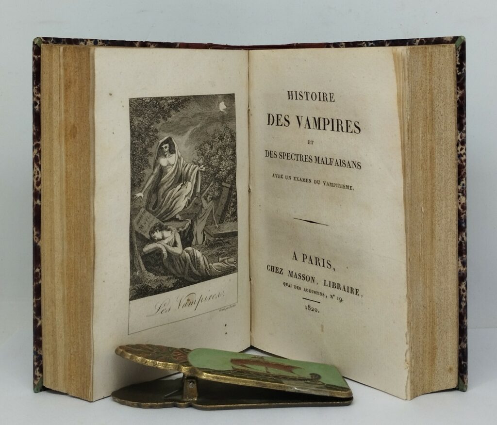 L’Histoire des Vampires, non signé, a sans doute également pour auteur Collin de Plancy. Ce livre se présente quant à lui comme un traité. Il est structuré en trois parties comprenant notamment des récits du même type que ceux d’Infernaliana, et se conclut par une longue bibliographie commentée consacrée aux « nouveautés sur les vampires, les spectres, les loups-garoux, etc., etc. » – près de 30 titres répartis sur dix-sept pages. C’est un ouvrage que l’on trouve difficilement avec le frontispice et sans mention d’édition. En effet, les exemplaires sont rares et, de plus, ceux que l’on rencontre sont souvent incomplets de la planche en question, ou bien possèdent une mention de deuxième ou troisième édition. Certains ont les deux défauts.