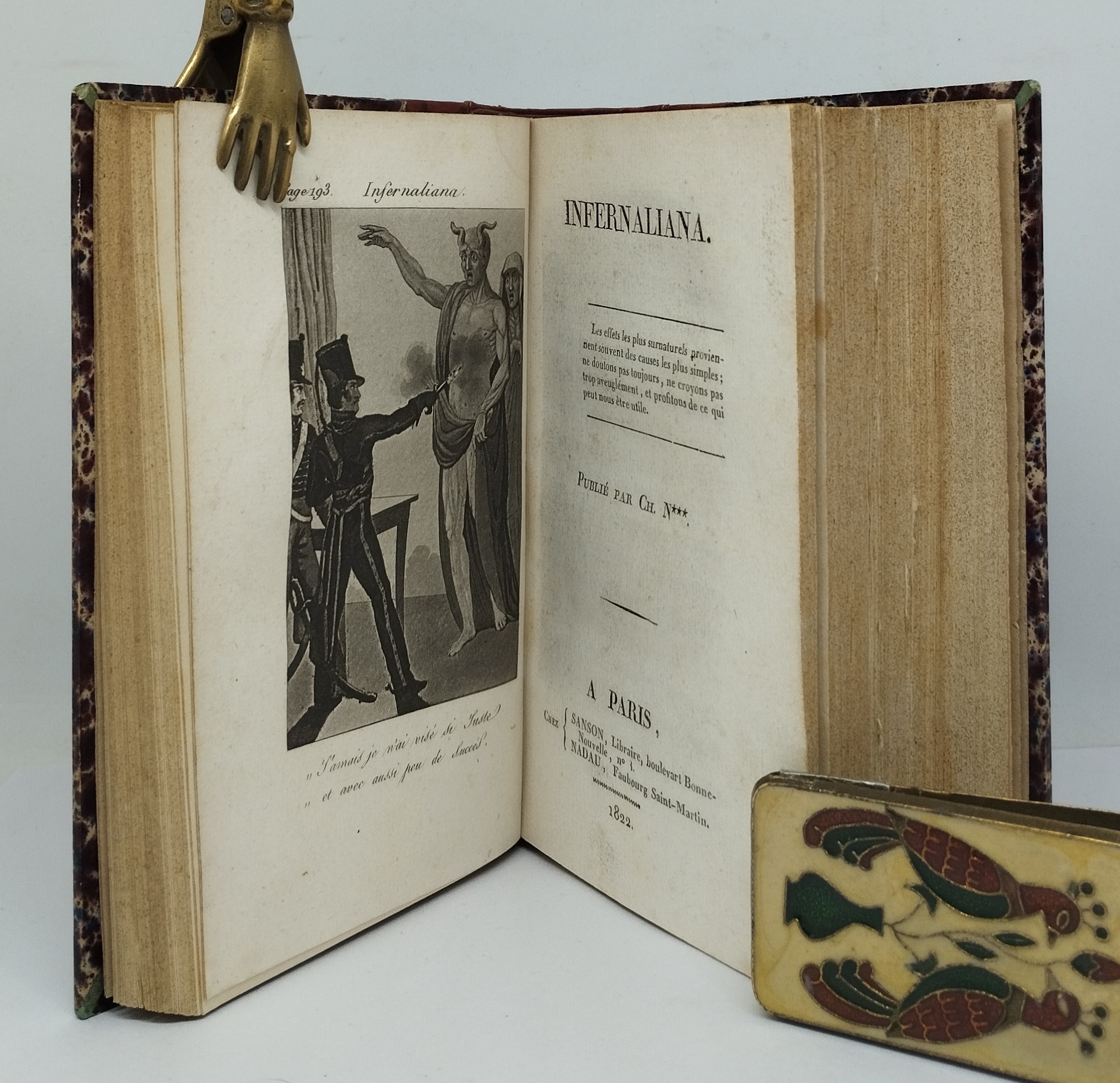 Collin de Plancy (Jacques). Histoire des vampires et des spectres malfaisans avec un examen du vampirisme (Masson, 1820) / Infernaliana (Sanson, 1822). Reliés avec La Sorcellerie de Charles Louandre (Hachette, 1853) et Mesmer et le magnétisme animal, d’Ernest Bersot (Hachette, 1853), soit quatre tomes en un volume (demi-veau rouge de la seconde moitié du dix-neuvième siècle). Le faux-titre des deux derniers ouvrages cités, ceux de Louandre et Bersot, manque (pas de trace d’arrachage). 100×157 mm (feuillets un peu plus rognés sur la hauteur que sur la largeur)