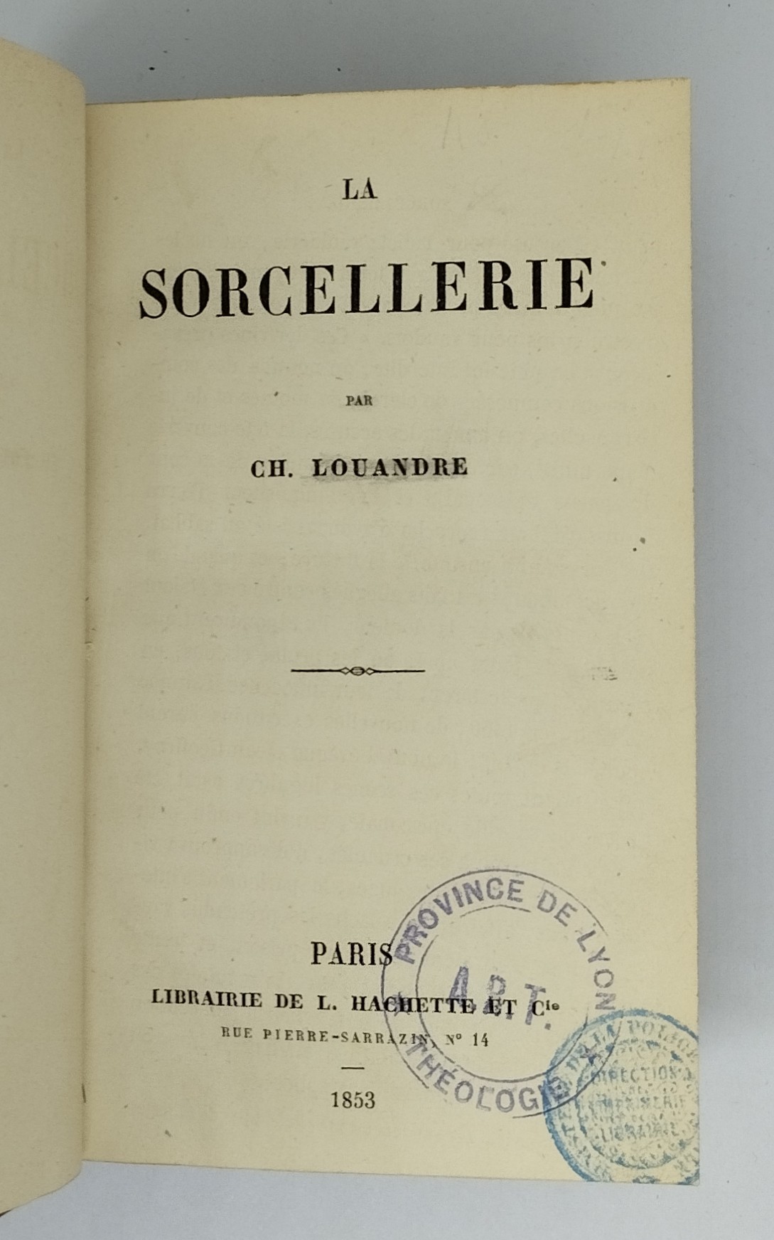 Manque de papier au premier plat de la reliure. Cachet de la Bibliothèque Valpré (Ecully)*** sur les deux gardes volantes ainsi qu’au titre du livre de Louandre. Bon état intérieur (quelques rousseurs ou taches, un petit manque angulaire à un feuillet d’Infernaliana…) Notre volume porte la tomaison 15 et, en dessous : « Sorcellerie, Spectres, Démons, Magnétisme ».