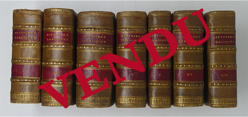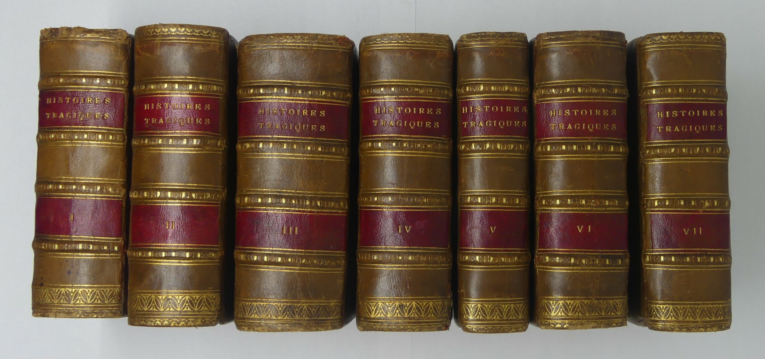 BOAISTUAU, Pierre et BELLEFOREST, François de. Les Histoires Tragiques, Extraictes des œuvres Italiennes de Bandel, & mises en langue Françoise. 7 tomes en 7 volumes. Lyon, Pour Cesar Farine, 1583 pour le tome VI ; Par Benoist Rigaud, 1594 pour le t. III ; Par Benoist Rigaud, 1595 pour le t. VII ; Par les heritiers de Benoist Rigaud, 1601 pour le t. V ; Chez Pierre Rigaud, 1616 pour les t. I, II et IV. 7 volumes in-16 (111 x 71 mm). Tome 1 : A-Z82A-Z83A-H83I7 : 439 ff. foliotés 2-437 ; t. 2 : a-z8 A-Z82A-I8 : 440 ff. paginés 3-878 ; t. 3 : *8 a-z8 A-Z82A-S82T7 : 527 feuillets foliotés 1-514 ; t. 4 : a-z8 A-Z82A-I8 : 440 ff. paginés 3-875 ; t. 5 : A-Z82A-P8 : 304 ff. paginés 3-606 ; t. 6 : a-z8 A-Z82A-H8 (H8 blanc) : 432 ff. paginés 2-840 ; t. 7 : ã8 (ã8 blanc) a-z82A-Z83A-C8 : 400 ff. foliotés 1-386. Basane caramel, dos à nerfs ornés, filets dorés, pièces de titre et de tomaison en maroquin rouge, tranches teintées rouges (reliures uniformes du XIXe). Rognage parfois un peu court. Quelques galeries de vers, notamment au tome V, quelques traces d’usure aux reliures mais bons exemplaires. Ex-libris de James Hazen Hyde : « Le livre c’est un ami qui ne change jamais »