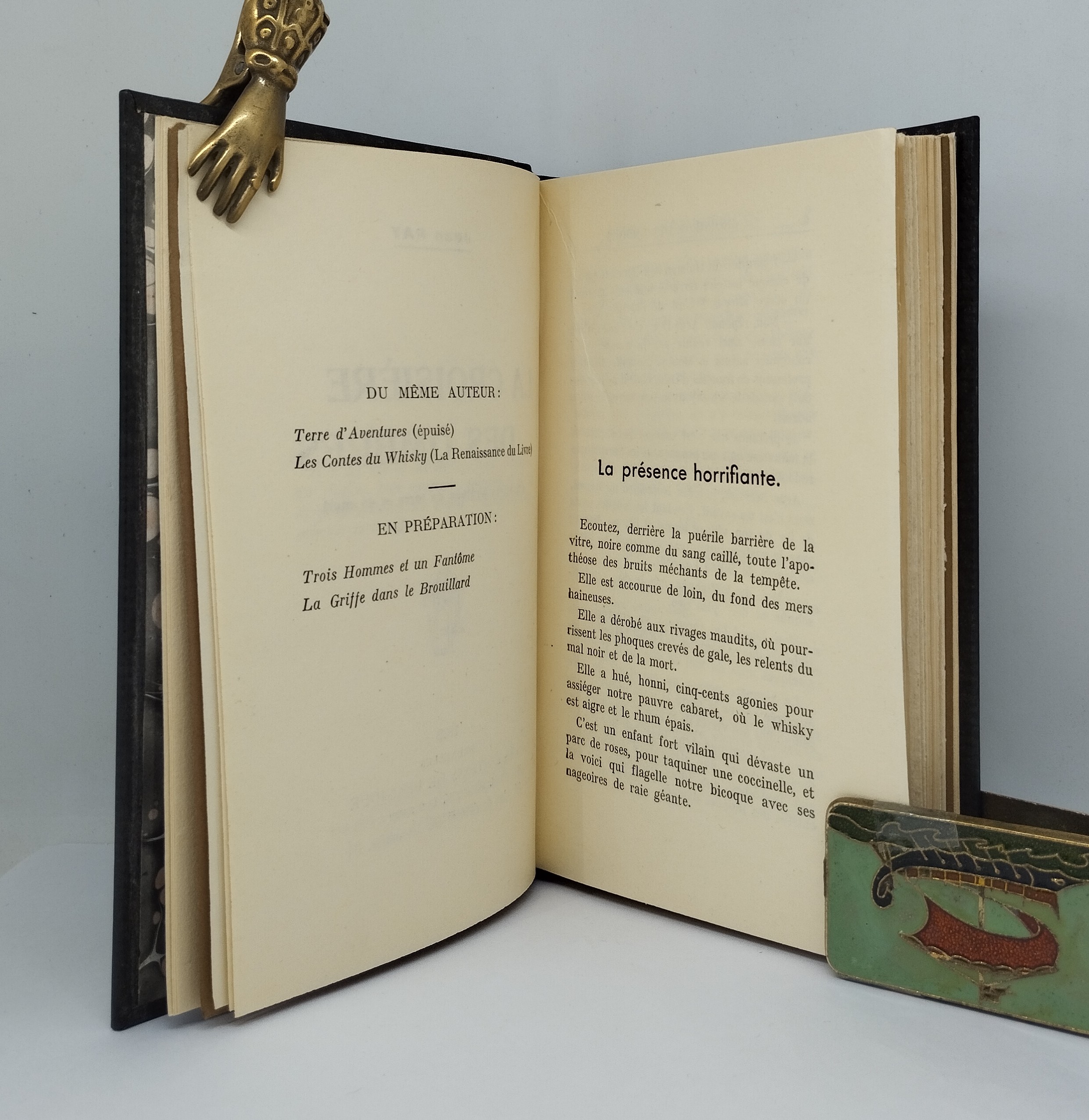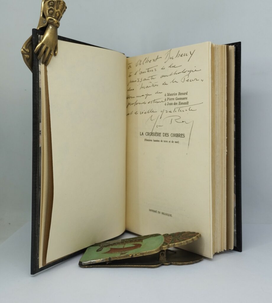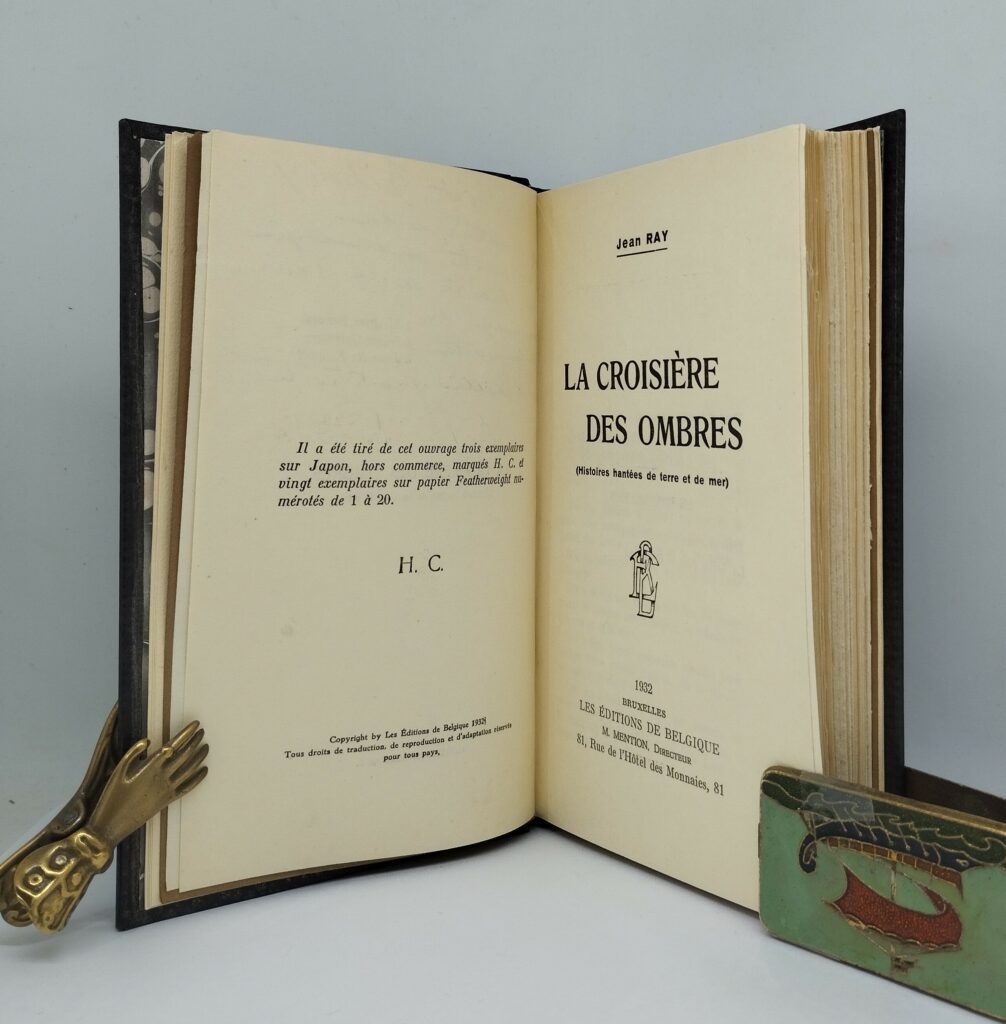 Ray, Jean. La Croisière des Ombres (Histoires hantées de terre et de mer). Les Éditions de Belgique, 1932. Reliure demi-chagrin moderne, noir. 121×190 mm. Édition originale. Un des trois sur Japon, tous hors commerce, marqués H. C., seul tirage de luxe avec 20 exemplaires sur papier Featherweight. Envoi : « A Albert Dubeux, à l’auteur de la puissante anthologie des Maîtres de la Peur. Hommage de profonde estime et de réelle gratitude ».