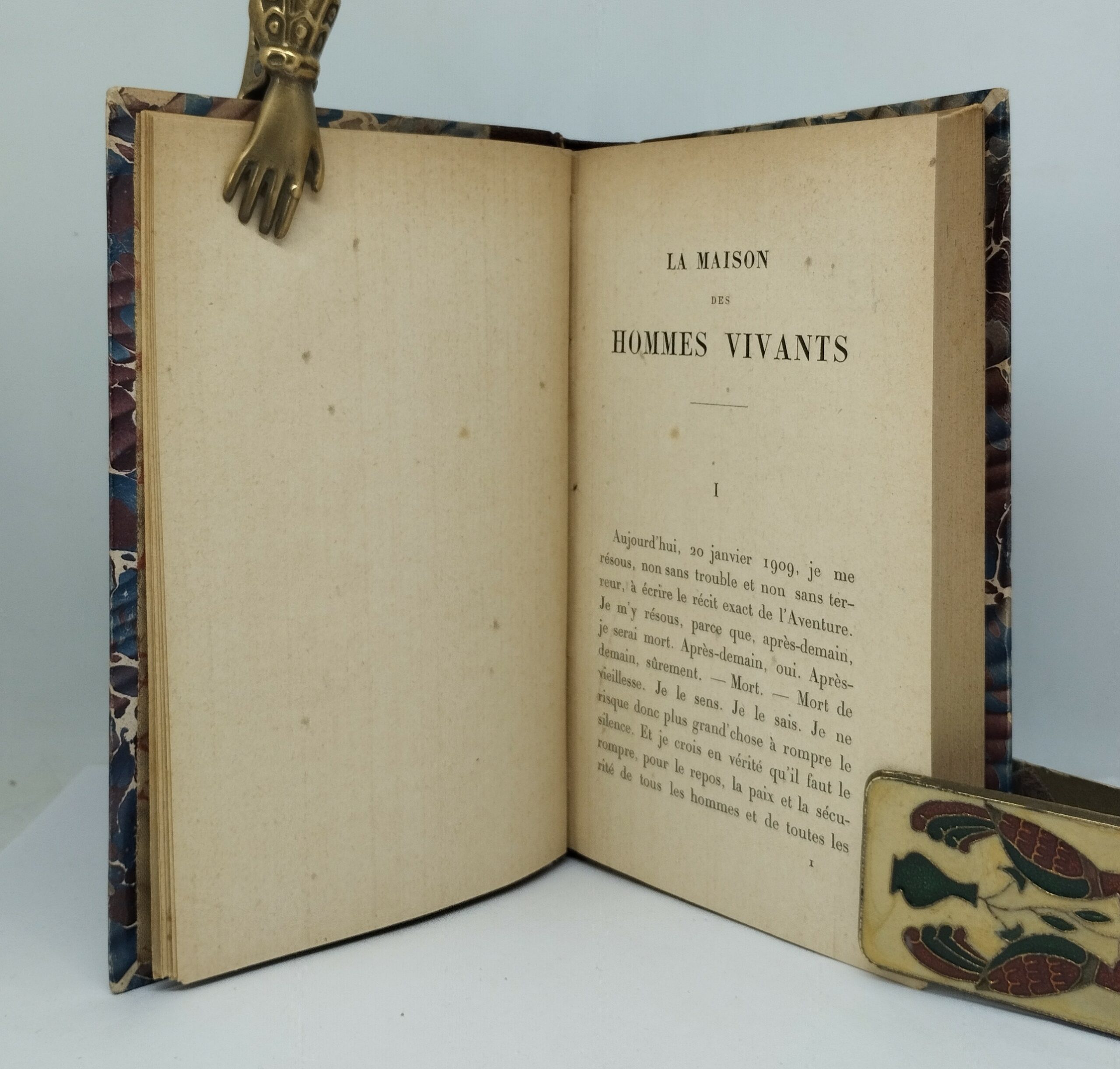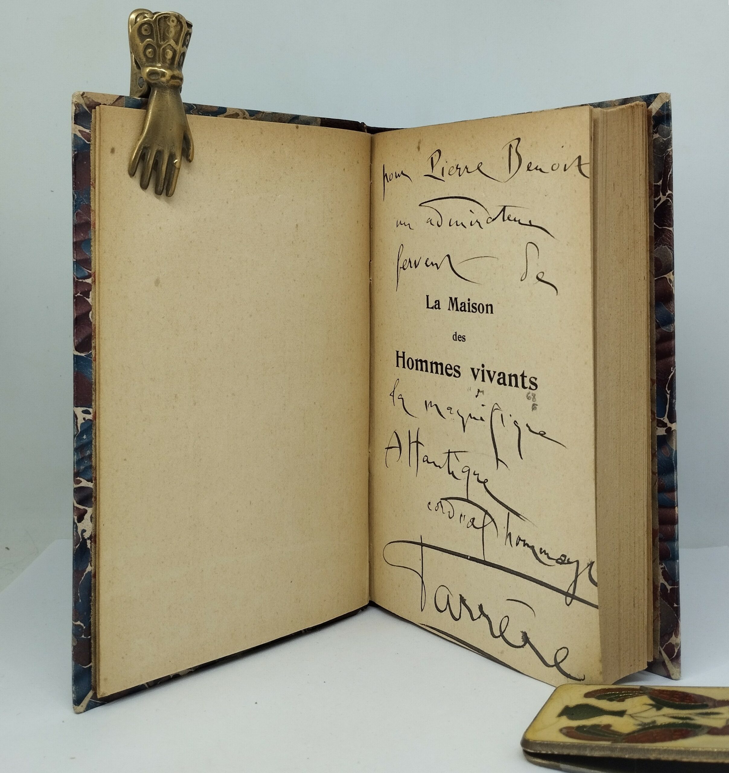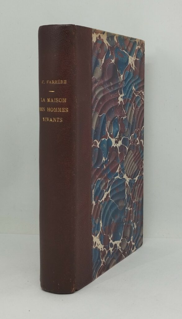 FARRÈRE (Claude). La Maison des Hommes vivants. Paris, librairie des Annales, 1911. Un volume in-12 de 4 ff. et 299 pages. 120×184 mm. Demi-chagrin brun (reliure du début du XXe siècle). Couverture non conservée. Édition originale (tirage ordinaire). Envoi de l’auteur à Pierre Benoît.