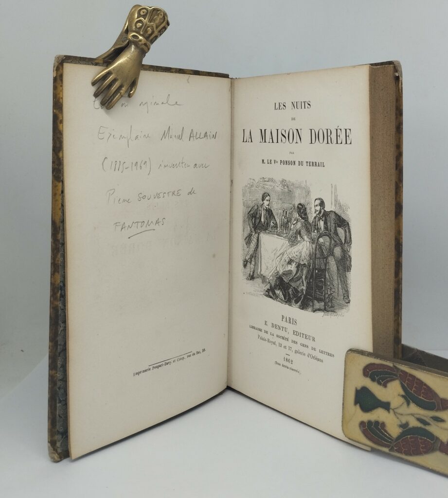 Ponson du Terrail, Alexis [Allain, Marcel]. Les Nuits de la Maison dorée. Paris, Dentu, 1862. Demi-basane havane, quelques frottements, coins émoussés (reliure de l’époque). 304 p. 109×172 mm. Edition originale.