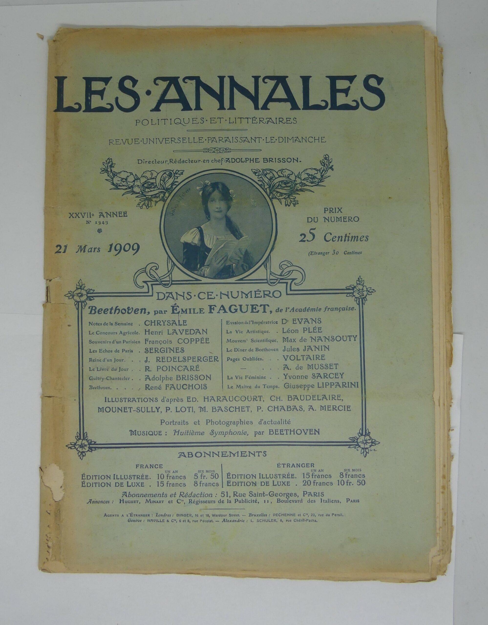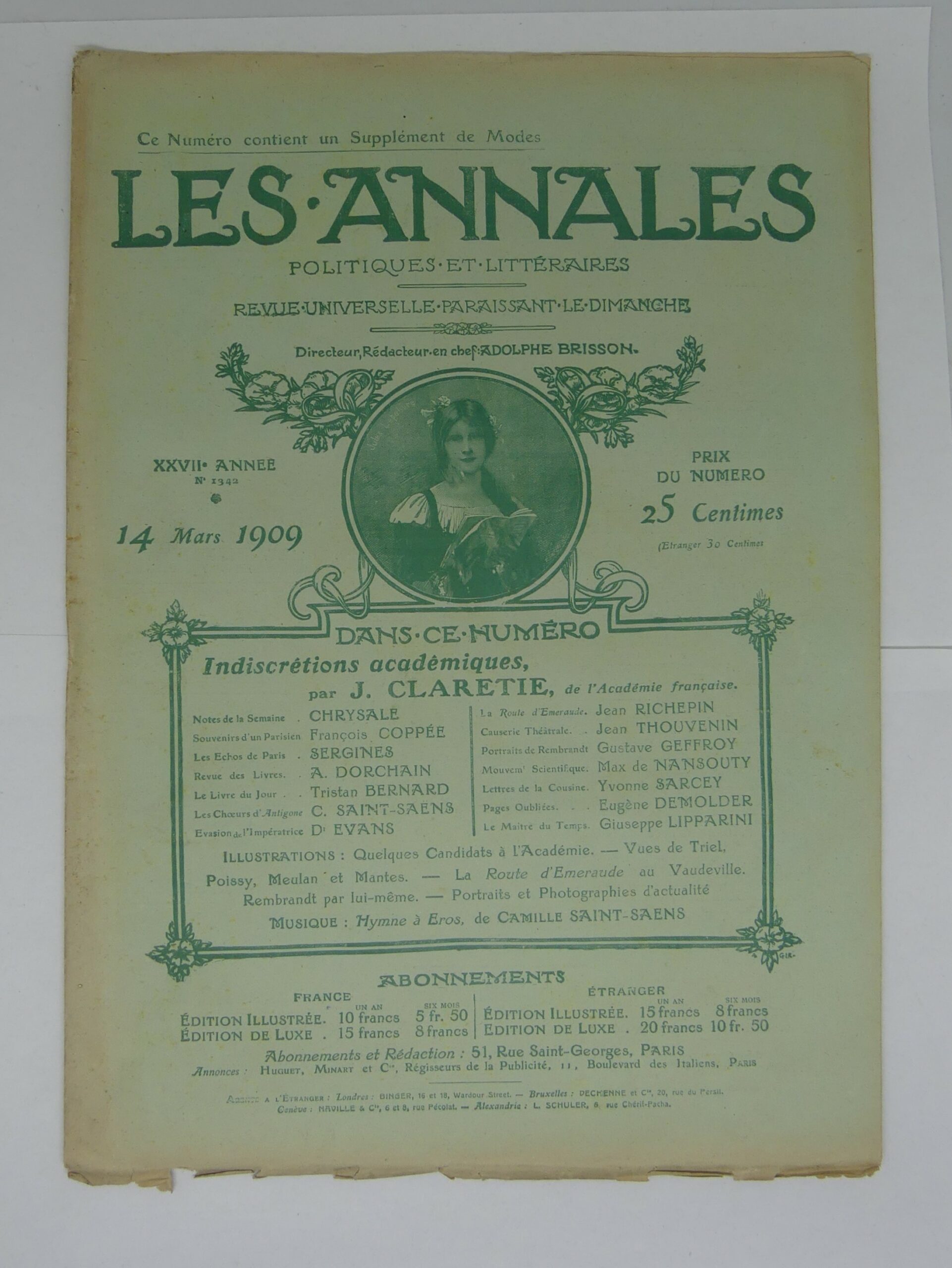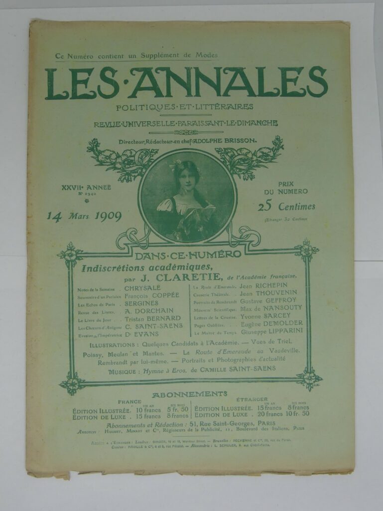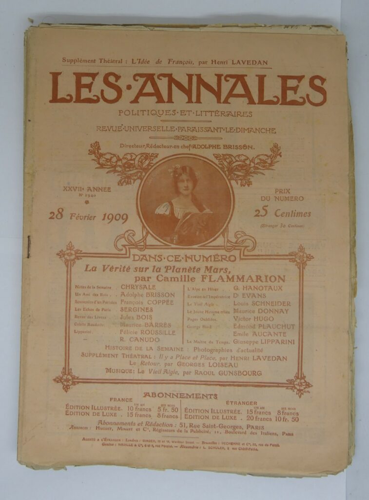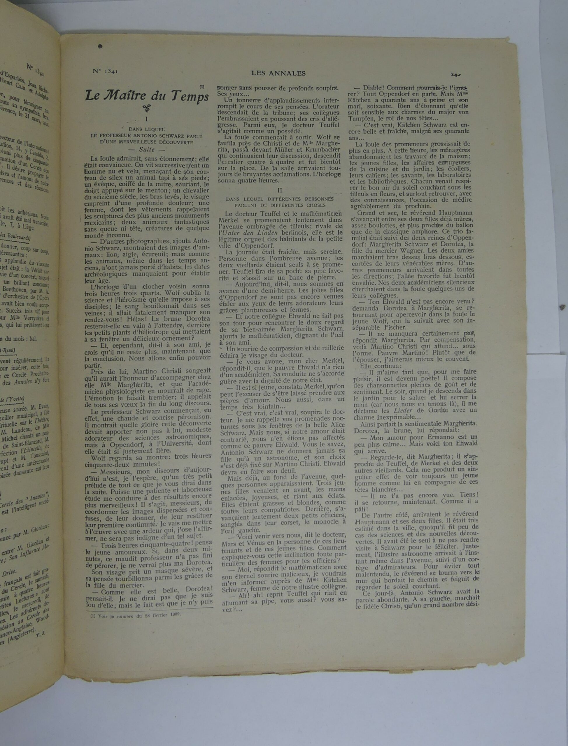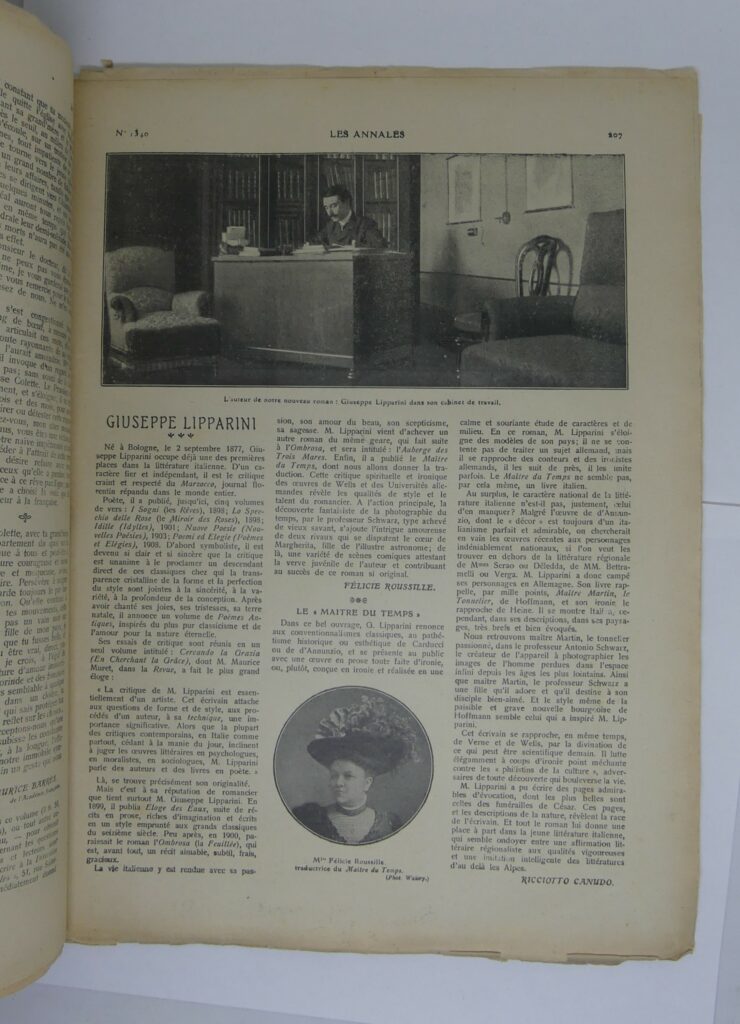 Lipparini (Giuseppe). Le Maître du temps, in Les Annales politiques et littéraires. 11 numéros brochés parus du 28 février au 9 mai 1909. Une vingtaine de feuillets chacun, couvertures comprises. Numéros 1340 à 1350 [le n° 1340 contient également une présentation de l’auteur et de son roman]. Environ 250×335 mm. Numéros en bon ou très bon état, sauf celui du 21 mars, défraichi, avec des trous dans la couverture, mais néanmoins acceptable.