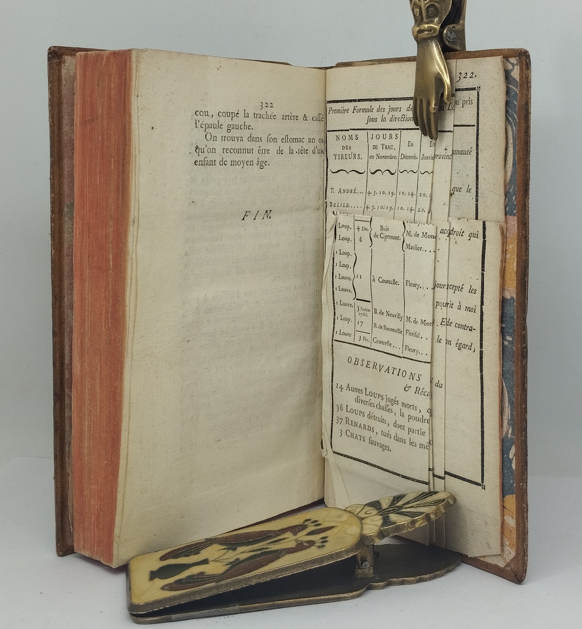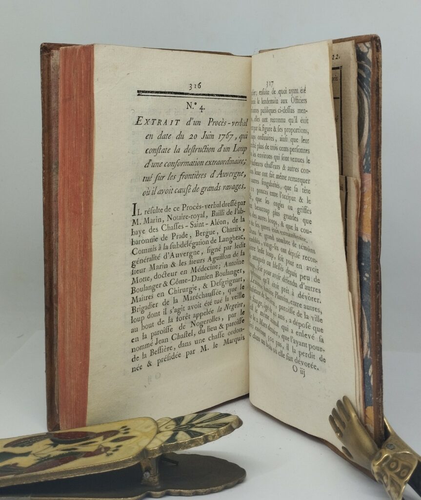 A la fin de ce livre, figure un texte de 7 pages intitulé « Extrait d’un Procès-verbal en date du 20 juin 1767, qui constate la destruction d’un Loup d’une conformation extraordinaire ; tué sur les frontières d’Auvergne, où il avait causé de grands ravages. » Selon Jean Richard, il s’agit à quelques variations minimes près du « Rapport Marin », du nom du notaire qui le rédigea le lendemain de la mort de la bête. Ce rapport sous forme manuscrite fut révélé en 1958 par Elise Seguin*, qui l’avait découvert, aux Archives Nationales (fonds agriculture, destruction des animaux nuisibles). Il précise notamment les caractéristiques de l’animal (largeur des pattes etc.)