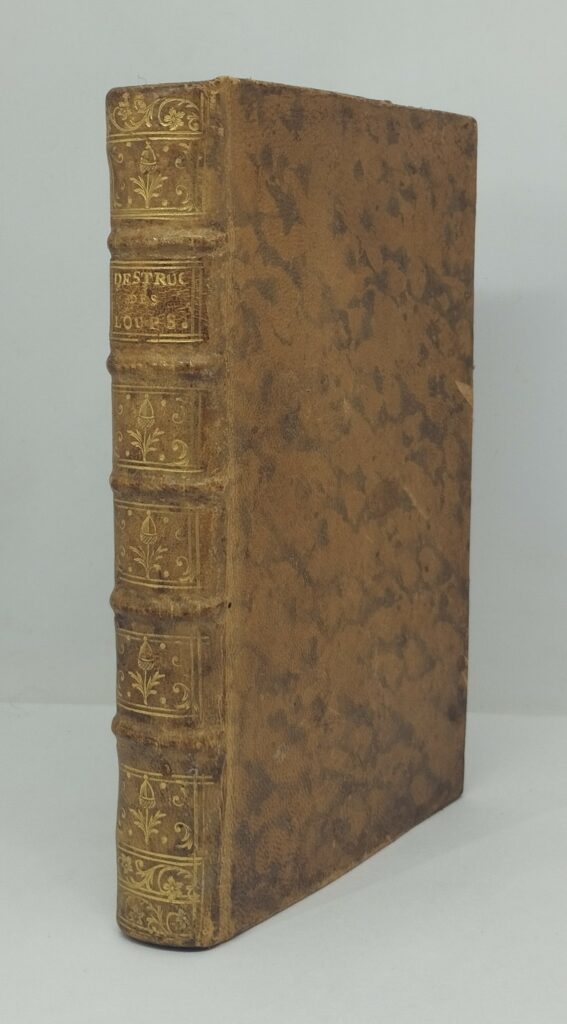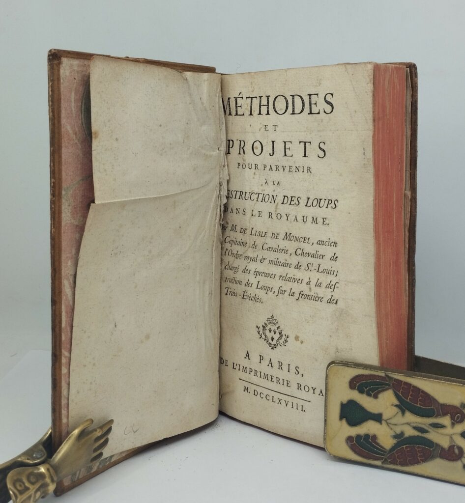 De Lisle de Moncel (Nicolas). Méthodes et projets pour parvenir à la destruction des loups dans le royaume. A Paris, de l’Imprimerie royale. xiv et 322 pages. Un tableau dépliant relié à la fin, au sujet des loups tués de 1765 à 1768. Pleine basane (reliure de l’époque). Trois manques angulaires de papier, pages ix-x et 163-166, une tache sans gravité pages 279-280, une petite déchirure sans manque à la planche, une éraflure au premier plat. Le livre « baille » un peu à cause de la planche dépliante et de la première garde, froissée. Édition originale.