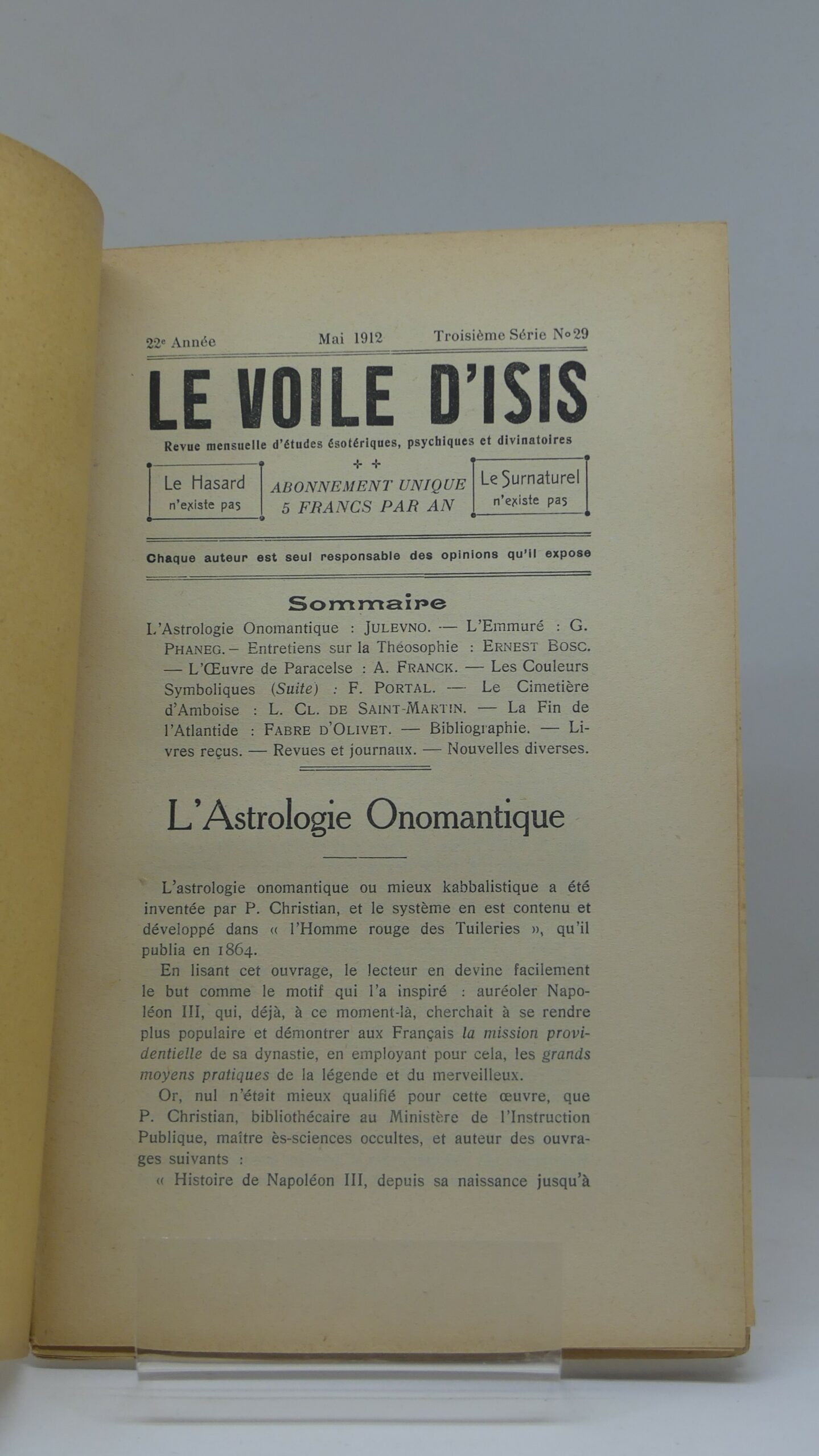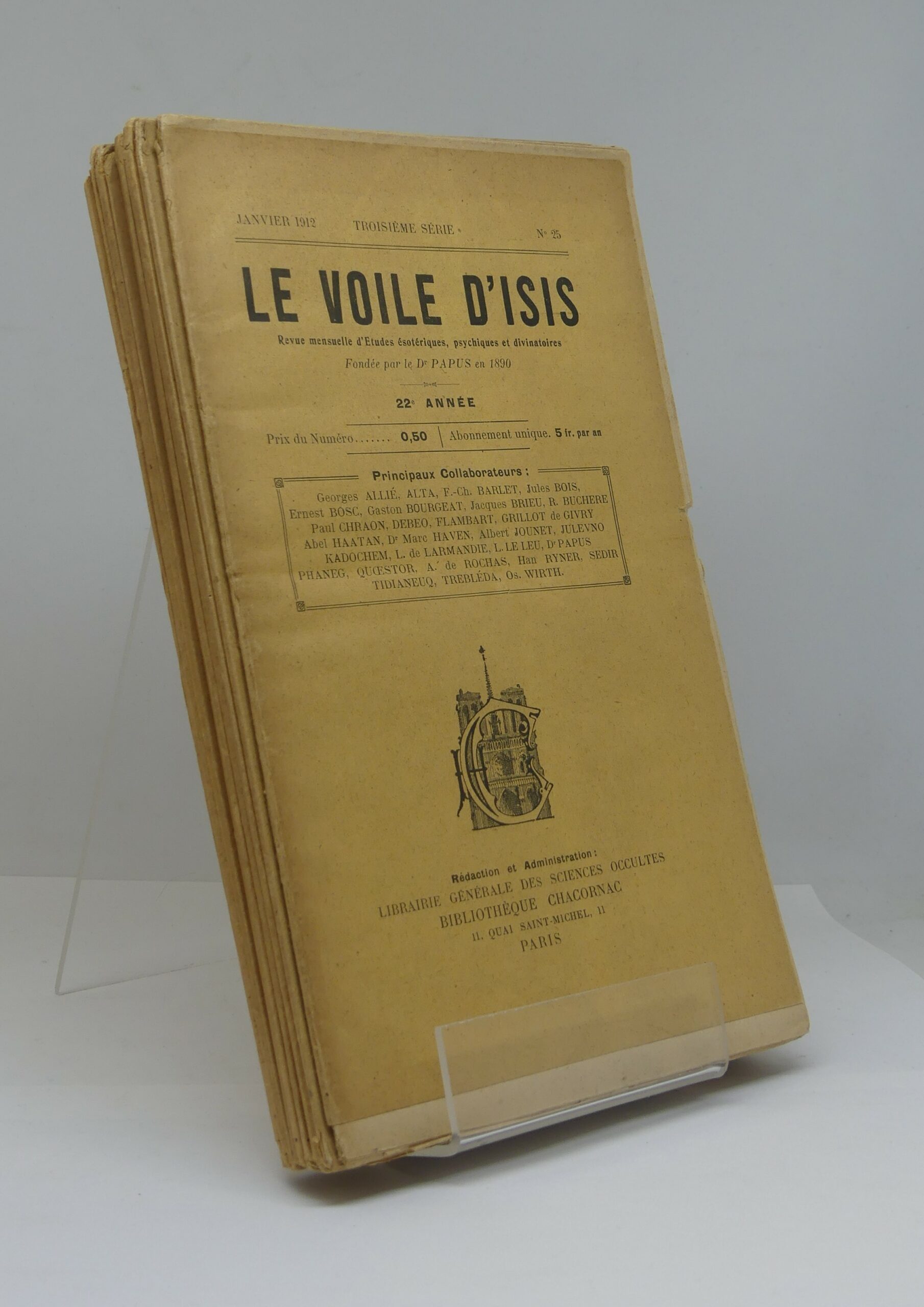 [PHANEG (Georges)]. Le voile d’Isis, Revue mensuelle d’Études ésotériques, psychiques et divinatoires. Fondée par le Dr Papus en 1890. 22e année. Paris, Librairie Générale des Sciences Occultes. Bibliothèque Chacornac. Année 1912 complète, brochée (n° 25 à 36). 32 pages par numéro. Environ 143×225 mm.