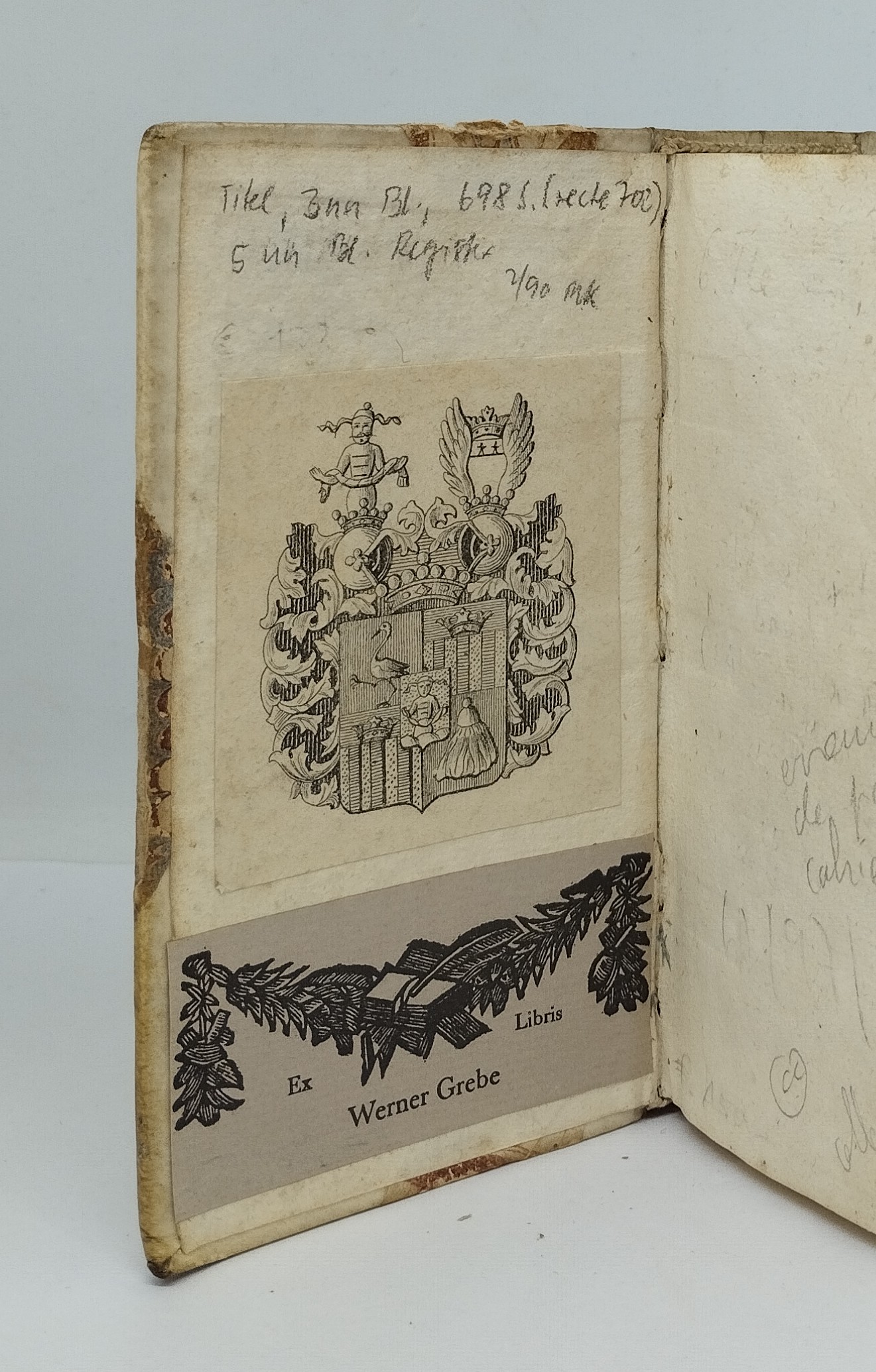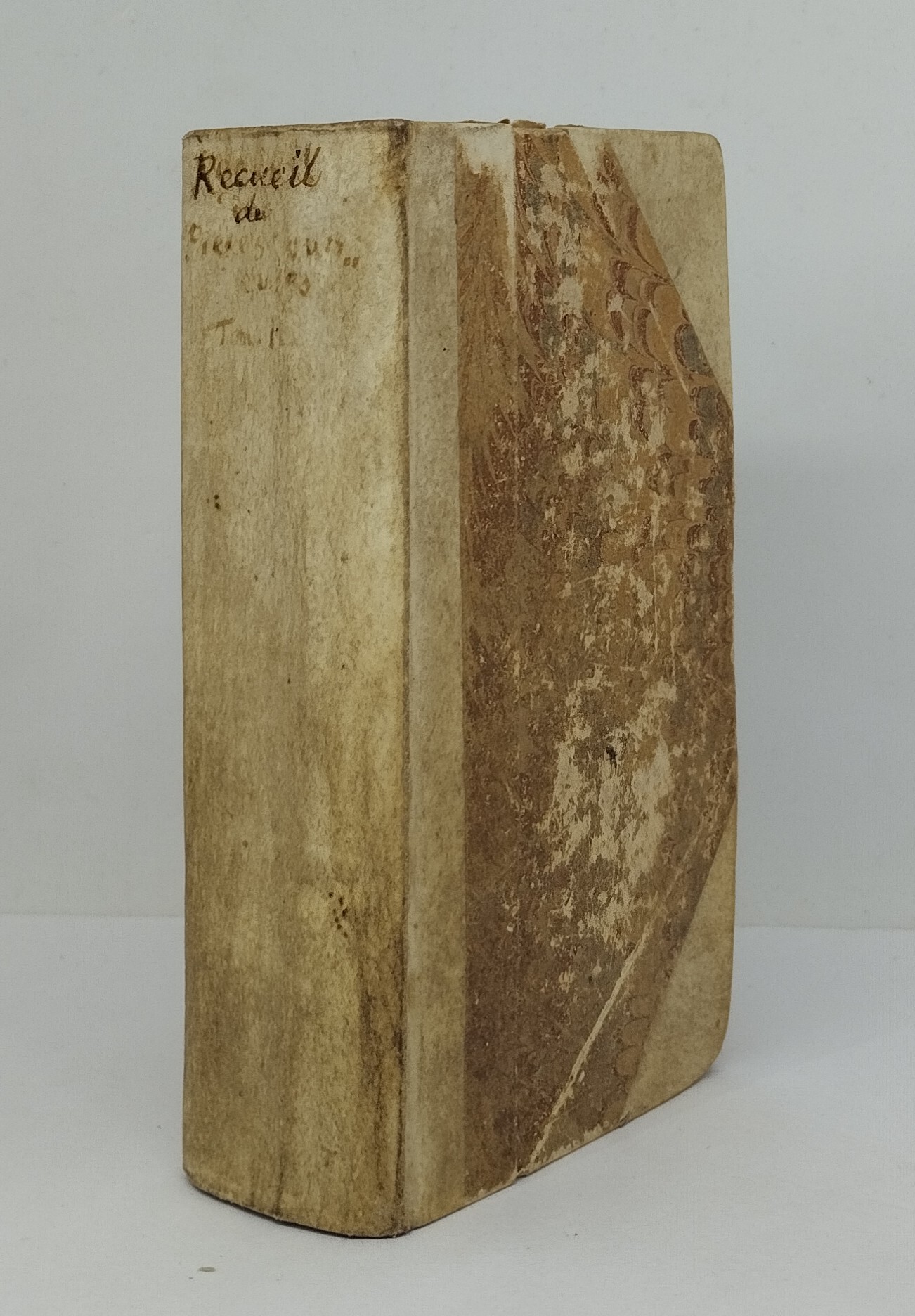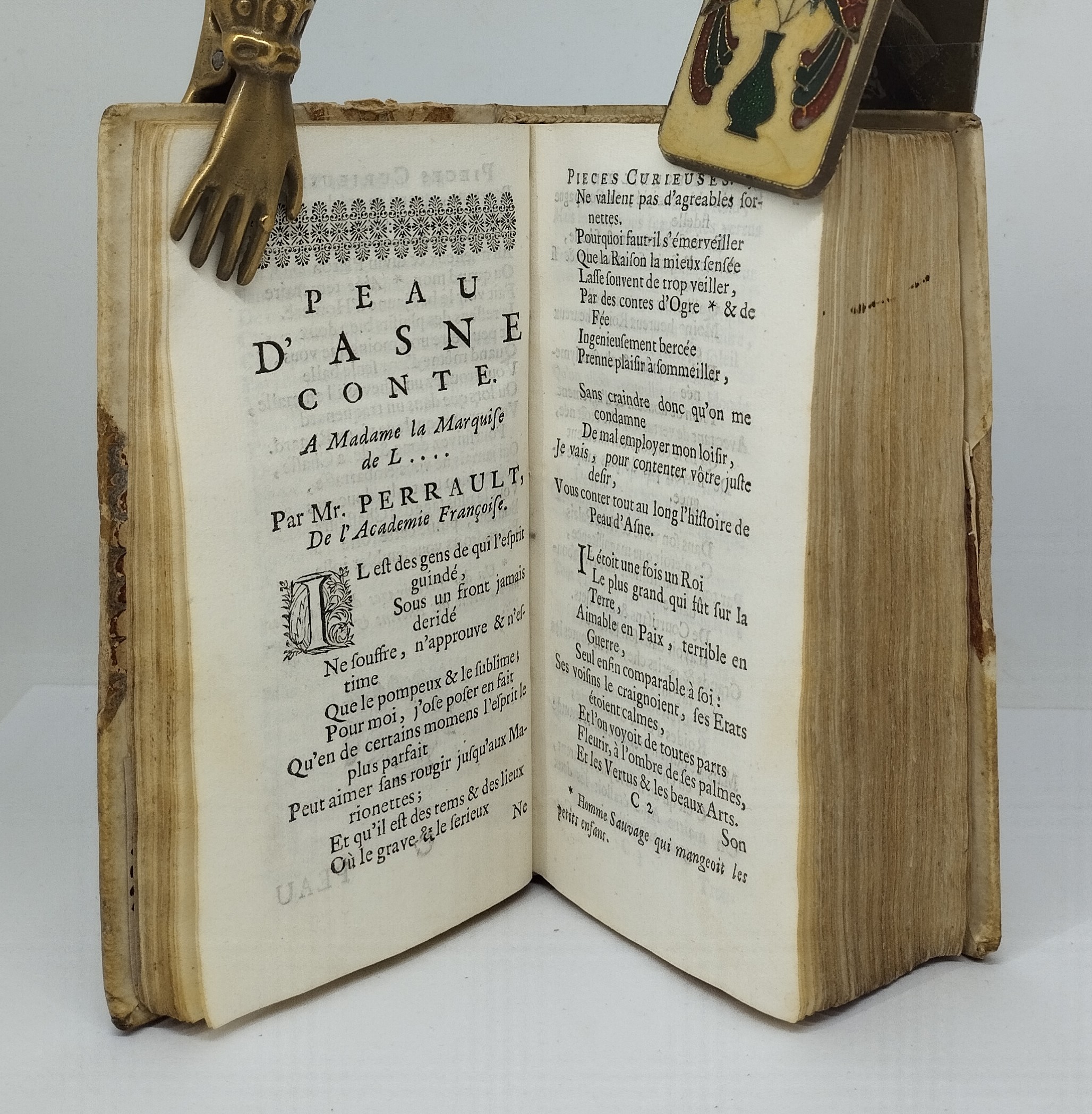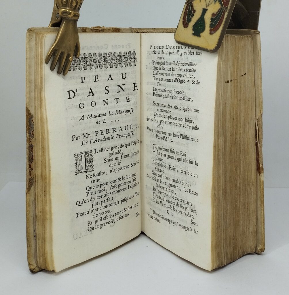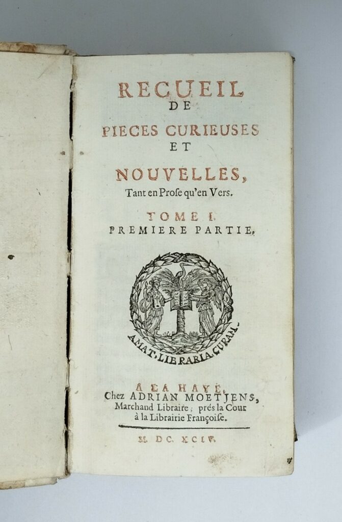 [Perrault, Charles]. Recueil de Pièces curieuses et nouvelles, Tant en Prose qu’en Vers. Tome I seul (sur 5). La Haye, Chez Adrian Moetjens, 1694. Six parties reliées en 1 volume. Titres à la marque d’Adrian Moetjens. Demi-vélin à coins (reliure du 18e siècle). Titre, 3 ff. n. ch., 698 p., 5 ff. n. ch. Pagination continue. 72×137 mm. Plats de la reliure frottés, vélin terni, titre inscrit à la main, en partie effacé. Trace d’encre sur la tranche. Un très petit manque de papier p. 551, une déchirure sans manque au milieu de la p. 55. Brunet, Supplément II, 417