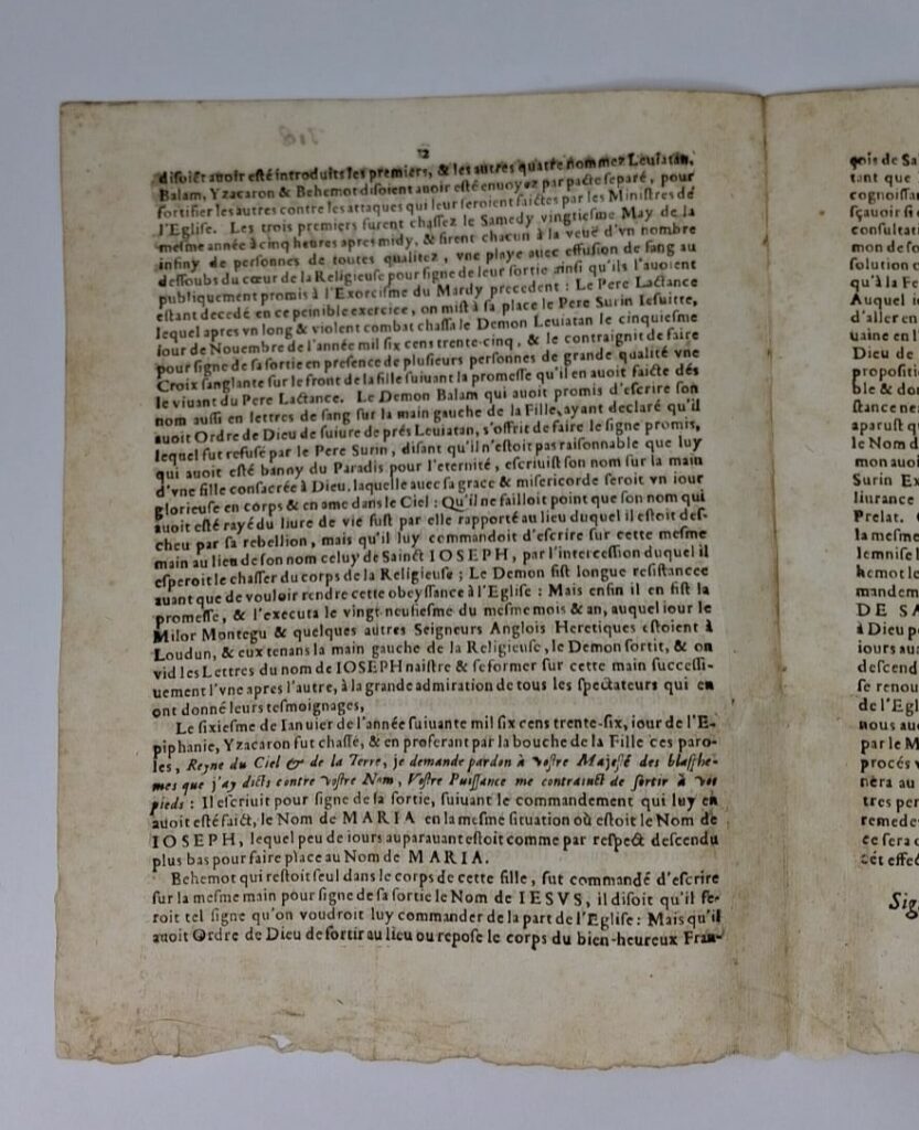 Le début du texte est consacré à un résumé des grandes étapes de la possession des Ursulines depuis le début (1632) jusqu’au moment où les exorcismes révèlent, en 1634, que la prieure Jeanne des Anges est possédée par sept démons. Pas une fois, Urbain Grandier n’est cité [concernant le déroulé de l’affaire de Loudun, le rôle du curé de Loudun et ses rapports avec les différents protagonistes de l’affaire, voir la fiche précédente]. Le texte relate ensuite la sortie des démons : « Les trois premiers furent chassez le Samedy vingtiesme May de la mesme année à cinq heures apres midy, et firent chacun à la veuë d’vn nombre infiny de personnes de toutes qualitez, vne playe auec effusion de sang au dessoubs du cœur de la Religieuse pour signe de leur sortie ainsi qu’ils l’auoient publiquement promis à l’Exorcisme du Mardy precedent : Le Père Lactance estant decedé en ce peinible exercice on mist à sa place le Pere Surin Iesuitte, lequel apres un long et violent combat chassa le Demon Leviatan le cinquiesme iour de Novembre (…) le Demon sortit, et on vid les Lettres du nom de JOSEPH naistre et se former sur cette main successivement l’vne apres l’autre, à la grande admiration de tous les spectateurs qui en ont donné leurs tesmoignages. Le sixiesme de Ianvier de l’année suivante mil six cens trente-six, iour de l’Epiphanie, Yzacaron fut chassé (…) Behemot qui restoit seul dans le corps de cette fille… » (p. 2)