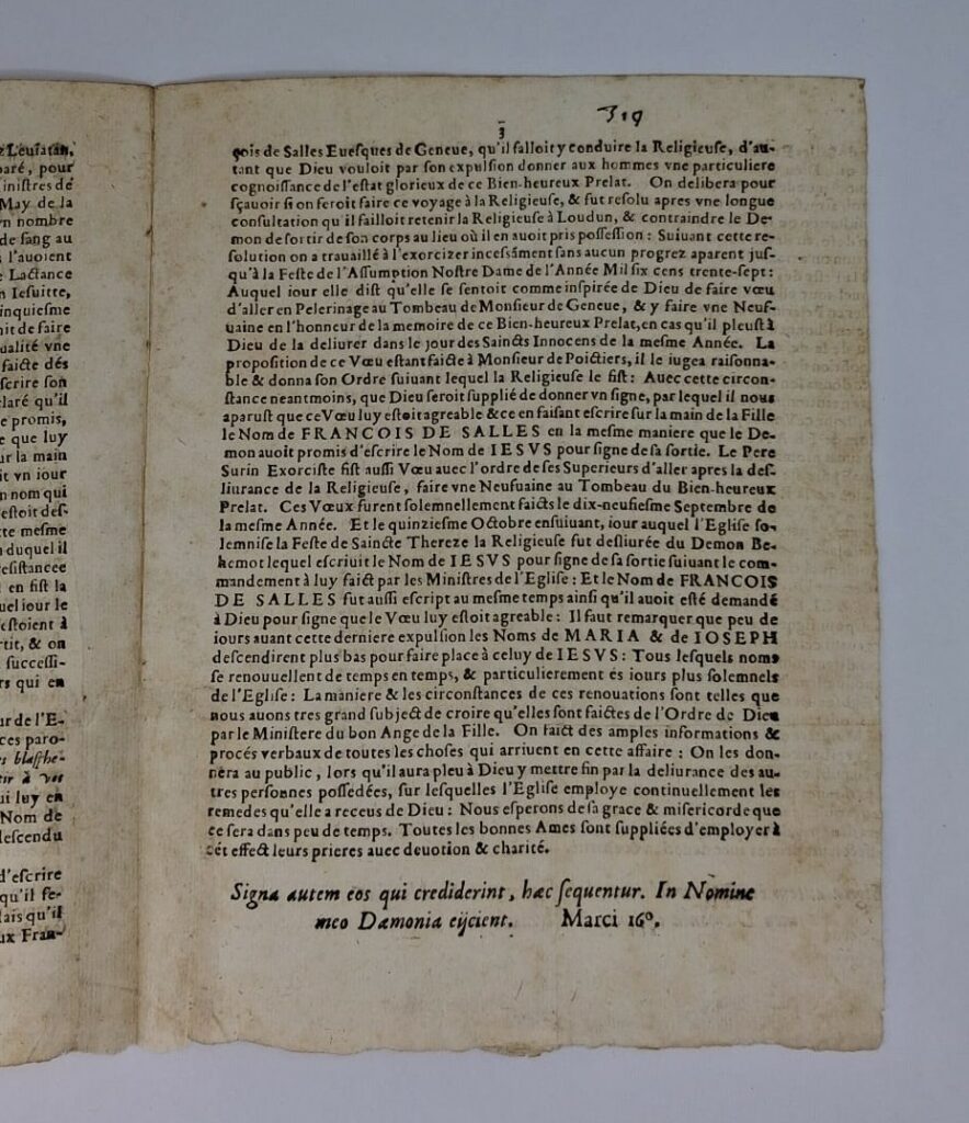 Représentation sommaire des Signes Miraculeux qui ont esté faicts à la gloire de Dieu & de son Eglise, en la sortie des sept démons qui possedoient le Corps de la Mère Prieure des Religieuses Ursulines de Loudun ; s.l., s.e., s.d. (1637). Édition originale. Yve-Plessis 1317. Broché, 3 p. 170×223 mm. Restauration de papier à la charnière, sans atteinte au texte.