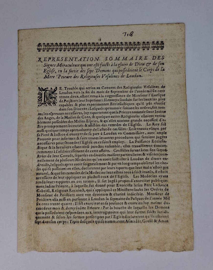 Représentation sommaire des Signes Miraculeux qui ont esté faicts à la gloire de Dieu & de son Eglise, en la sortie des sept démons qui possedoient le Corps de la Mère Prieure des Religieuses Ursulines de Loudun ; s.l., s.e., s.d. (1637). Édition originale. Yve-Plessis 1317. Broché, 3 p. 170×223 mm. Restauration de papier à la charnière, sans atteinte au texte.