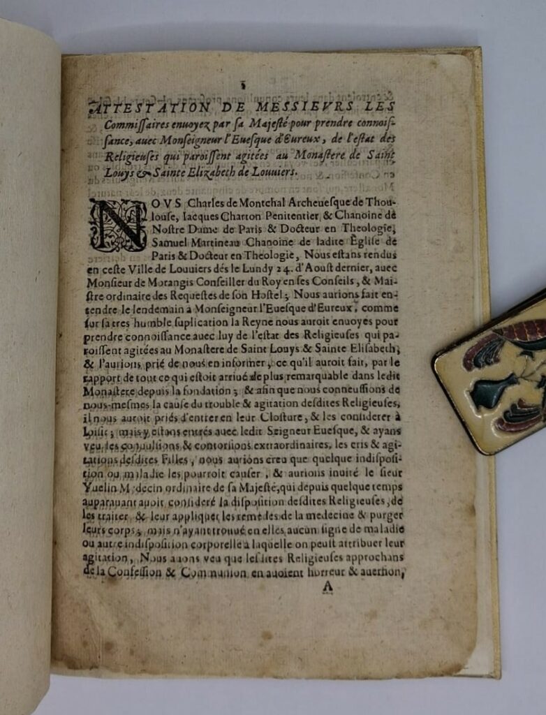 Le deuxième texte, dont les deux auteurs sont docteurs en théologie, va également à l’encontre des conclusions du docteur Yvelin, mais les arguments développés sont plus concrets : « Nous avons veu que lesdites Religieuses approchans de la Confession et Communion en avoient horreur et aversion et entroient dans leurs convulsions proferans plusieurs blasphèmes, injures et paroles sales, quoy qu’estans en leur naturel, elles nous semblassent fort simples, sages, ingénues et modestes, et éloignées de ces extravagances et fureurs, et incapables de faintise et de malice…..elles courboient leur corps en derrière en forme d’arc sans s’appuyer des mains, ne touchant la terre que des tallons et du front, et demeuroient un temps notable en ceste posture…ne touchoit terre que du tallon du pied droit… Nous avons tous jugé d’un commun advis en nos consciences que lesdites filles sont, les unes vrayment possédées, et les autres obsédées et maléficiées. Faict à Louviers ce jeudy dixieme Septembre mil six cens quarante trois. »