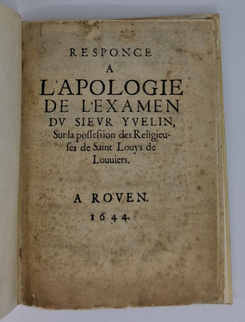 Chacun de nos deux textes a été publié longtemps avant le dénouement de l’affaire. Le premier est une attaque en règle de l’Apologie de l’examen du sieur Yvelin, sur la possession des religieuses de Saint Louys de Louviers, publiée en 1643, écrite par Yvelin lui-même selon Lemonnyer. L’auteur reprend, pour mieux les démonter, les arguments de l’auteur de cette publication : « Il impose à la vérité quand il dit que lors qu’on force ces Démons de faire quelque chose de difficile, ils respondent que leur pouvoir est borné en ce corps, et que Dieu ne leur a permis de faire rien qui ne soit naturel ; Pour ne faire rien sans la permission de Dieu, cela est tres-veritable, et le témoignage du Démon n’y est point necessaire, que si leur pouvoir n’estait limité, ils joüeraient de beaux jeux ; mais l’Ange de Dieu les a enchainés de chaisnes de fer au pied de la Croix ; c’est à dire les a rendus comme les Lyons d’Heliogabale sans dens et pouvoir de nous mal-faire… »