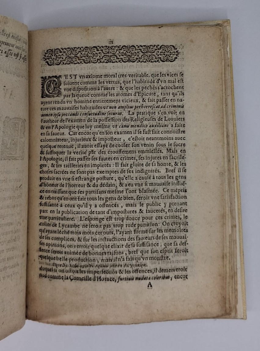 Chacun de nos deux textes a été publié longtemps avant le dénouement de l’affaire. Le premier est une attaque en règle de l’Apologie de l’examen du sieur Yvelin, sur la possession des religieuses de Saint Louys de Louviers, publiée en 1643, écrite par Yvelin lui-même selon Lemonnyer. L’auteur reprend, pour mieux les démonter, les arguments de l’auteur de cette publication : « Il impose à la vérité quand il dit que lors qu’on force ces Démons de faire quelque chose de difficile, ils respondent que leur pouvoir est borné en ce corps, et que Dieu ne leur a permis de faire rien qui ne soit naturel ; Pour ne faire rien sans la permission de Dieu, cela est tres-veritable, et le témoignage du Démon n’y est point necessaire, que si leur pouvoir n’estait limité, ils joüeraient de beaux jeux ; mais l’Ange de Dieu les a enchainés de chaisnes de fer au pied de la Croix ; c’est à dire les a rendus comme les Lyons d’Heliogabale sans dens et pouvoir de nous mal-faire… »