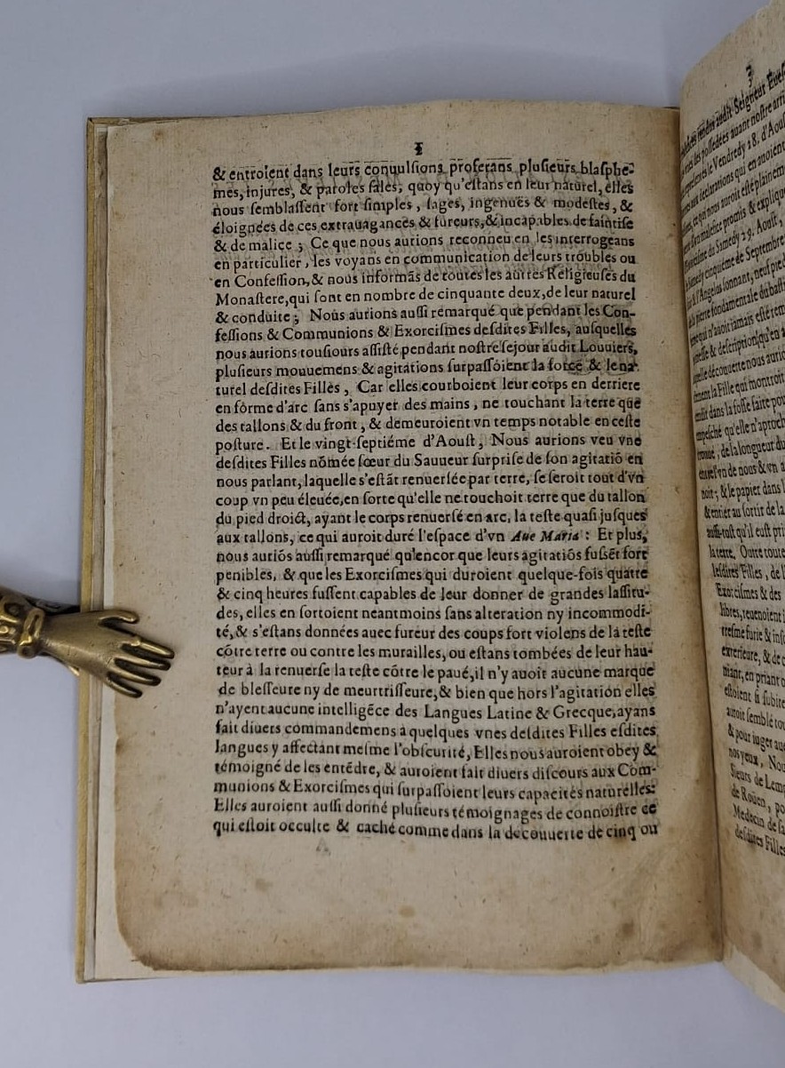 Le deuxième texte, dont les deux auteurs sont docteurs en théologie, va également à l’encontre des conclusions du docteur Yvelin, mais les arguments développés sont plus concrets : « Nous avons veu que lesdites Religieuses approchans de la Confession et Communion en avoient horreur et aversion et entroient dans leurs convulsions proferans plusieurs blasphèmes, injures et paroles sales, quoy qu’estans en leur naturel, elles nous semblassent fort simples, sages, ingénues et modestes, et éloignées de ces extravagances et fureurs, et incapables de faintise et de malice…..elles courboient leur corps en derrière en forme d’arc sans s’appuyer des mains, ne touchant la terre que des tallons et du front, et demeuroient un temps notable en ceste posture…ne touchoit terre que du tallon du pied droit… Nous avons tous jugé d’un commun advis en nos consciences que lesdites filles sont, les unes vrayment possédées, et les autres obsédées et maléficiées. Faict à Louviers ce jeudy dixieme Septembre mil six cens quarante trois. »