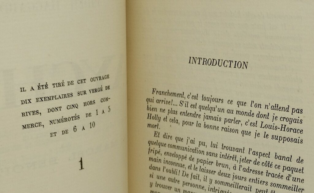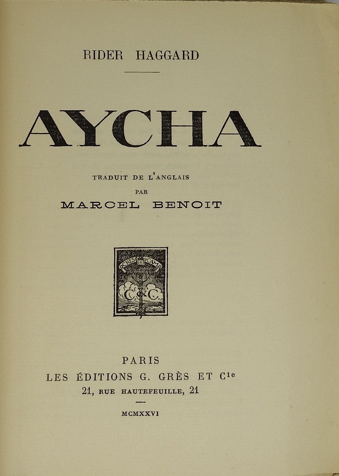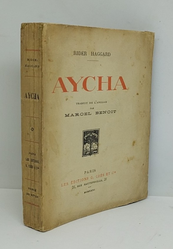 RIDER HAGGARD (Sir Henry). Aycha. Traduit de l’anglais par Marcel Benoit. Paris, Crès, 1926 (AI : 22 mai). Un volume broché. 1 ff. blanc, faux-titre, titre, vi, 274 p., 2 ff. (dont la table). 140×187mm. Édition originale française. Un des dix Vergé de Rives, seul grand papier (le N° 1). Brochage restauré, couverture salie, dos un peu gauchi, une tache en marge de quelques feuillets mais très bon état intérieur.