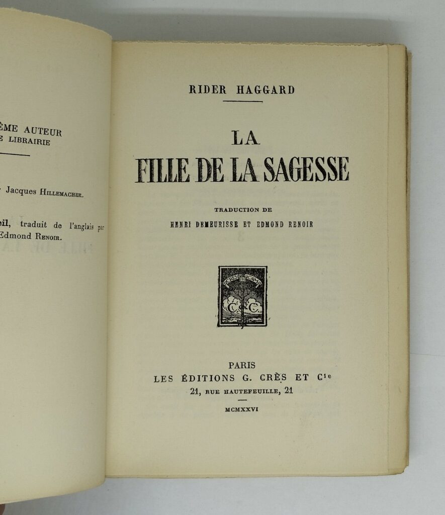 RIDER HAGGARD (Sir Henry). La Fille de la Sagesse. Traduction de Henri Demeurisse et Edmond Renoir. Paris, Crès, 1926 (imprimé en décembre 1925). Un volume broché. Faux-titre, titre, Introduction, 278 p. et 1 ff. Édition originale française. Un des dix vélin pur fil, seul grand papier (le N°3). 132×187 mm
