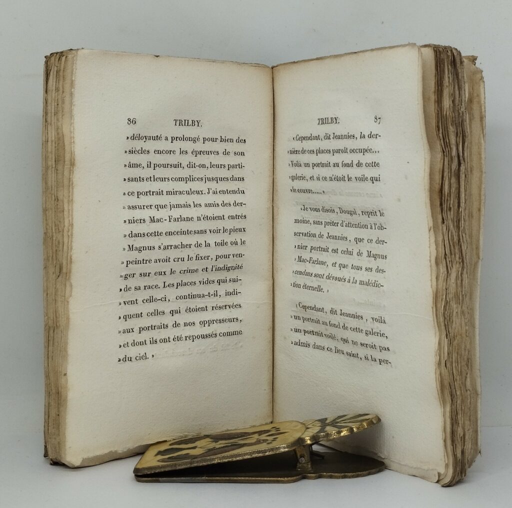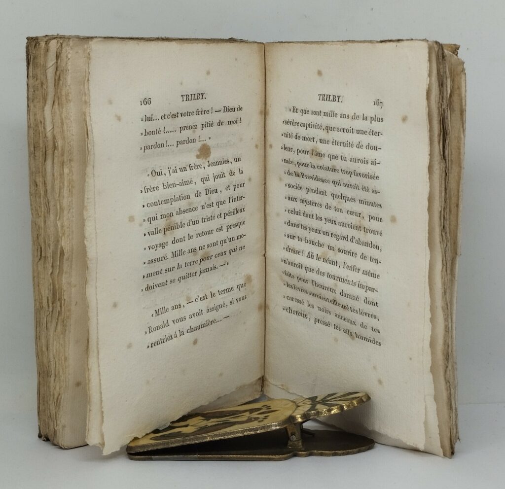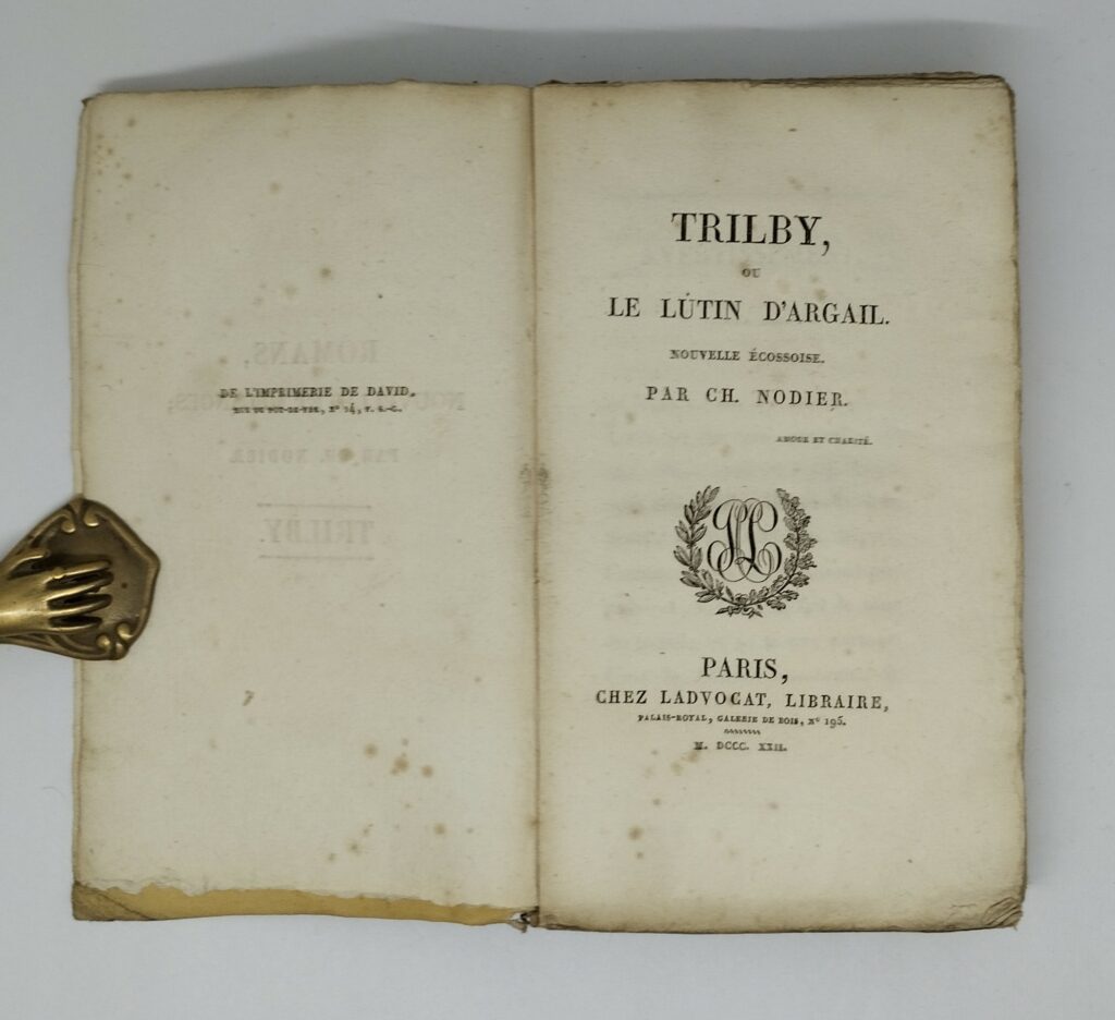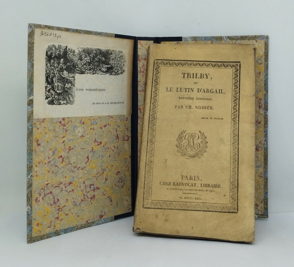 Nodier, Charles. Trilby, ou le Lutin d’Argail. Nouvelle Écossoise. Paris, Ladvocat, 1822. 197 p., 3 ff. non chiffrés (catalogue de l’éditeur). Broché, entièrement non rogné. 105×182 mm. Étui-chemise portant l’ex-libris « Livres Romantiques. M. et H. Hoquette ». Mouillure sur le second plat de la couverture se répercutant uniquement sur le feuillet de brochage. Dos insolé. Mors supérieur fendu sur 2,2 cm. Rousseurs sur certains feuillets. Exemplaire agréable, à grandes marges.