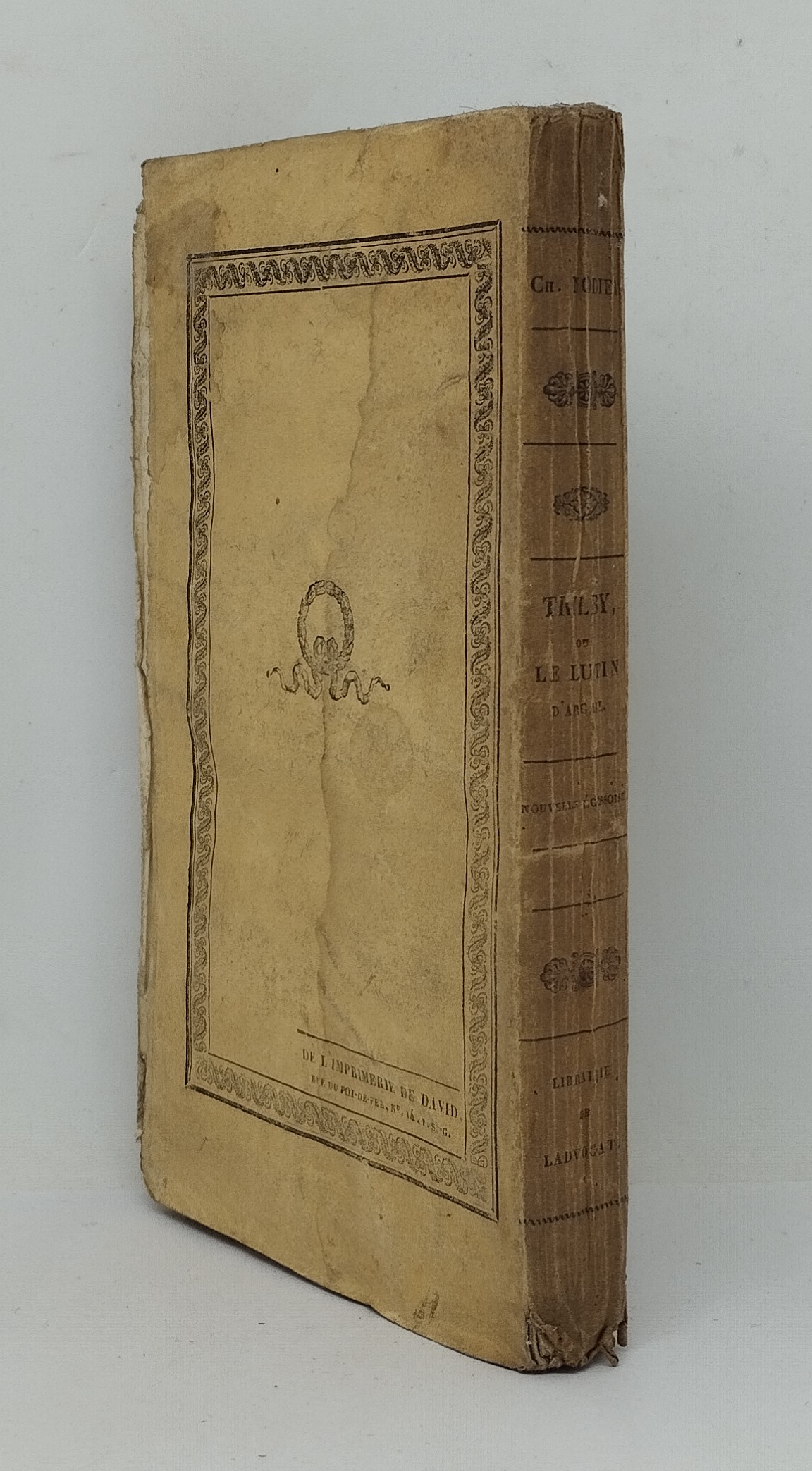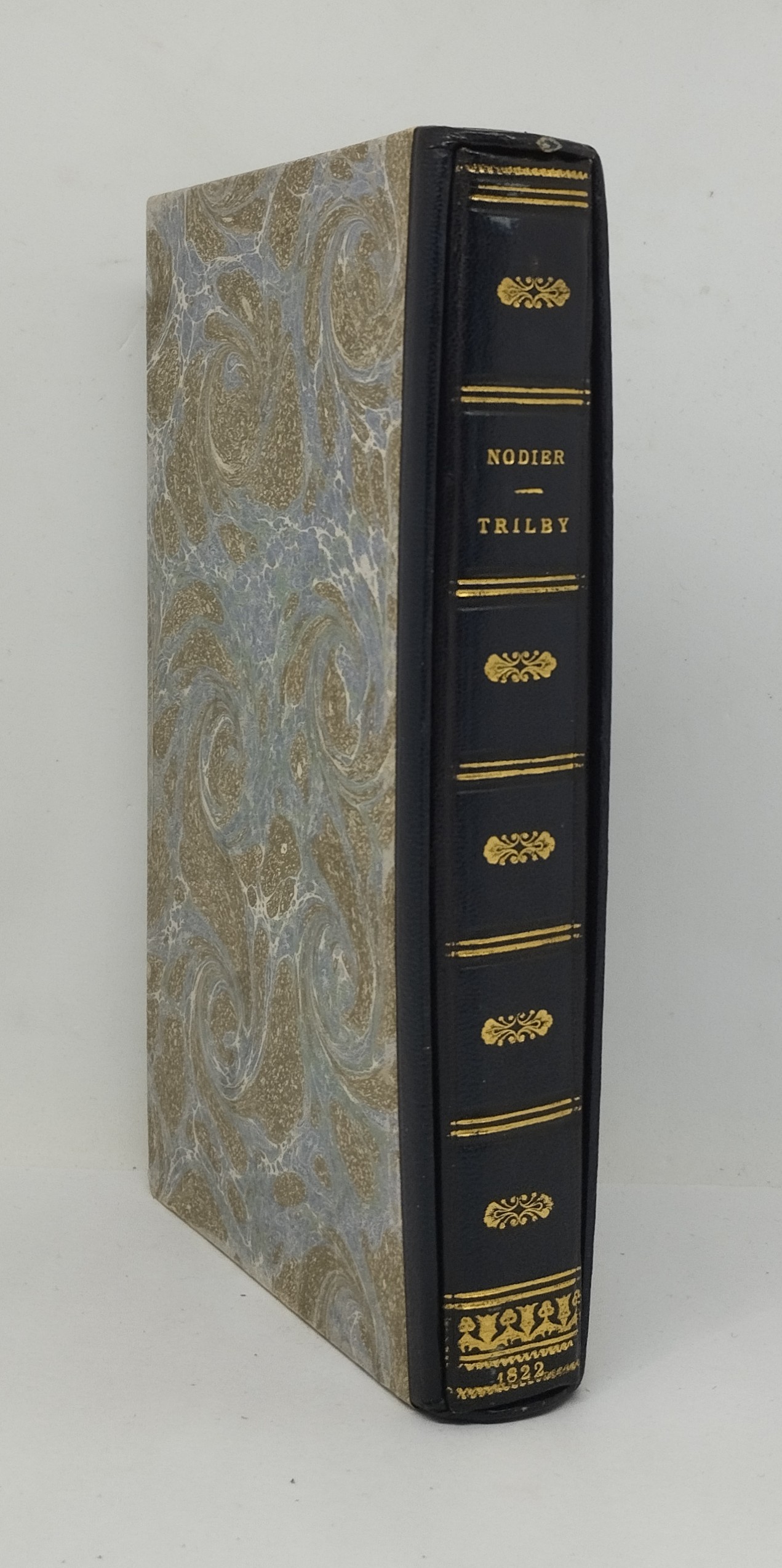 Nodier, Charles. Trilby, ou le Lutin d’Argail. Nouvelle Écossoise. Paris, Ladvocat, 1822. 197 p., 3 ff. non chiffrés (catalogue de l’éditeur). Broché, entièrement non rogné. 105×182 mm. Étui-chemise portant l’ex-libris « Livres Romantiques. M. et H. Hoquette ». Mouillure sur le second plat de la couverture se répercutant uniquement sur le feuillet de brochage. Dos insolé. Mors supérieur fendu sur 2,2 cm. Rousseurs sur certains feuillets. Exemplaire agréable, à grandes marges.