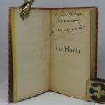 Littérature – de 1850 à 1900 DE SORR (Angelo). Le Vampire. Roman fantaisiste. Paris, Adolphe Delahays, 1852. Demi-chagrin violine, dos à nerfs orné (reliure de l’époque). Faux-titre, titre, 361 pages ; 1 ff. (table). 108×170 mm. Bon exemplaire, plutôt plaisant. Reliure un peu manipulée, quelques salissures ou rousseurs, des … ALEXANDRI (Vasile). Poésie roumane. Les Doïnas, Poésies moldaves. Traduites par J.-E. Voïnesco. Paris, De Soye et Bouchet, Imprimeurs, 1853. Un volume broché de 111 pages (96×153 mm). Les couleurs du brochage sont passées, le dos est insolé et fendillé, mais solide. Quelques rousseurs, sans … [JOUBERT, Léo] LE SIÈCLE ; 1855. Numéros des 3, 4, 7, 8, et 9 août. 4 pages chacun. Extraits d’une reliure (petits manques de papier aux charnières). Quelques taches à l’un des journaux, mais bon état. Environ 465×637 mm. 230 euros Ces numéros contiennent une assez longue histoire de vampire … La Mode Nouvelle, 1ere année – 1ere Livraison. Paris, 21 rue Louis-Le-Grand, 1856. Un volume in-8 de 528 p. dont la table. 149×239 mm. Demi basane (époque). Réunion des 9 premiers numéros de la nouvelle série (1er janvier au 21 mars). Nous ne disposons pas de la collation des numéros mais nous … MAUPASSANT (Guy de). Le Horla. Paris, Ollendorff, 1887. Un volume demi-percaline rouge. Couvertures conservées, un peu ternies, mais en parfait état par ailleurs (ni usure, ni déchirure). Reliure légèrement postérieure. Faux-titre, titre, 354 pp. ; 1 ff. (110×172 mm) Édition originale. Envoi … FÉVAL (Paul). Trois livres brochés : Le Chevalier Ténèbre, Paris, Ollendorff, Nouvelle Collection à deux francs, sans date (début XXe ?) ; La Vampire, Paris, Dentu, 1891 ; La Ville-Vampire, Paris, Dentu, sans date (entre 1898 et 1900). Les deux derniers titres font partie de la collection « Nos …